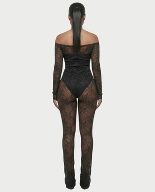 RAMILA Off-Shoulder Sheer Lace Top & Flared Pants Set