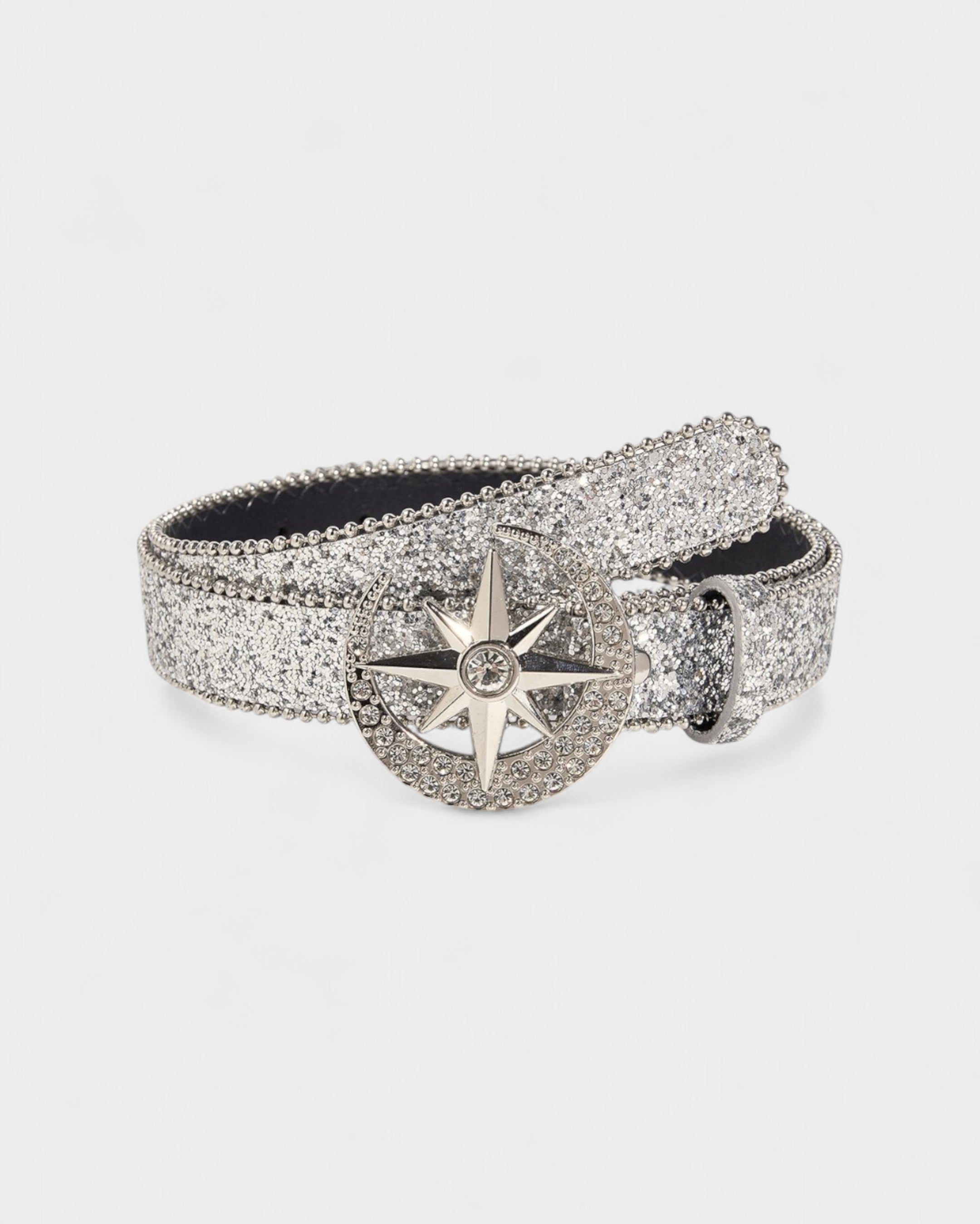 Add a cosmic touch to any look with this dazzling belt. Covered in all-over sparkle, this accessory catches the light with every move. The centerpiece is an intricately designed moon and star buckle, embellished with brilliant rhinestones, making it a statement piece that's out of this world.