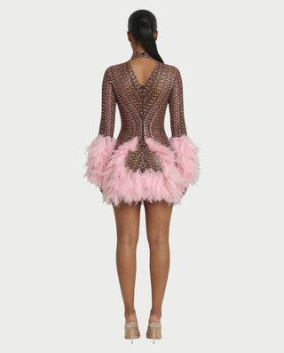 VINA Sheer Crystal Feather Trim Mini Dress