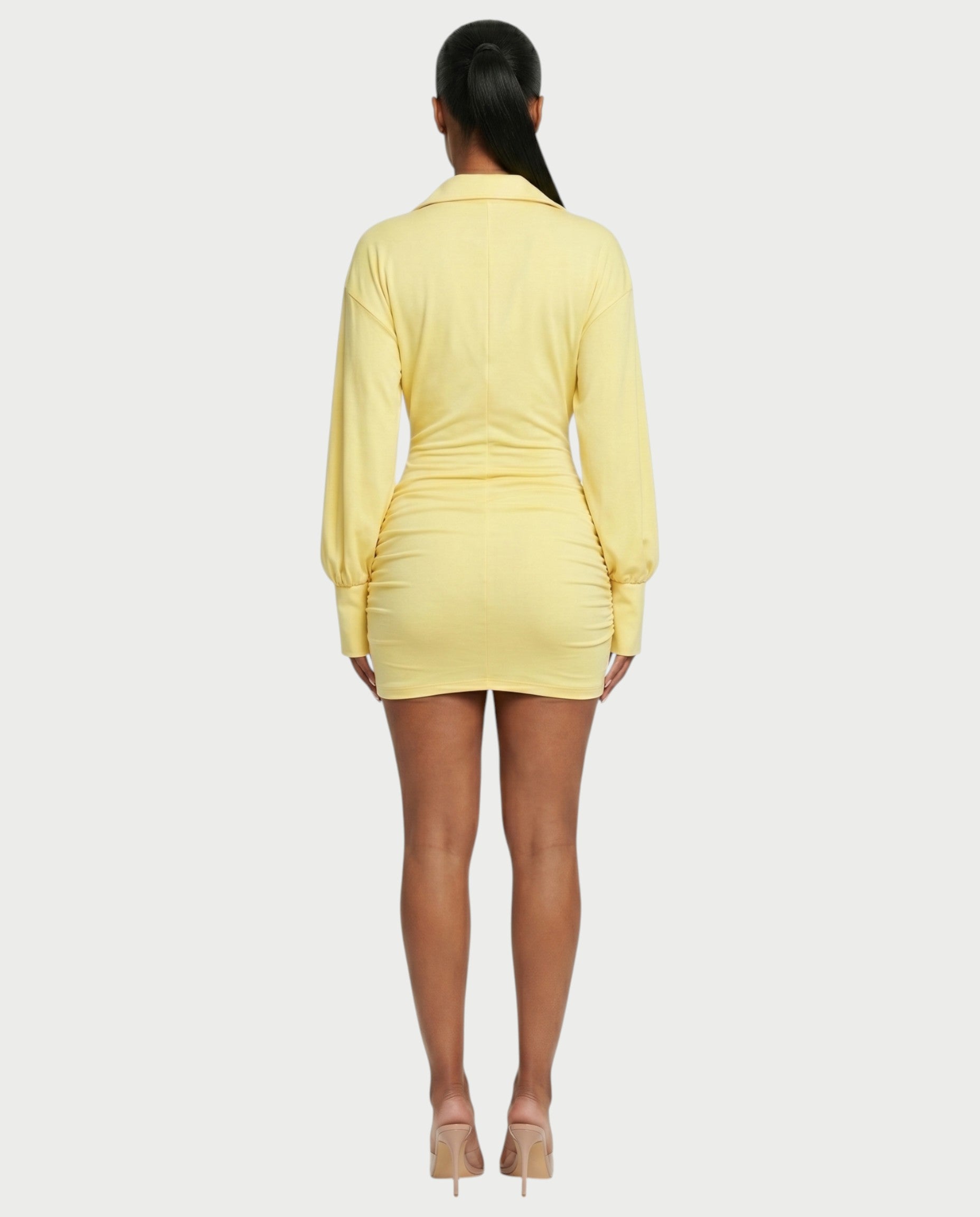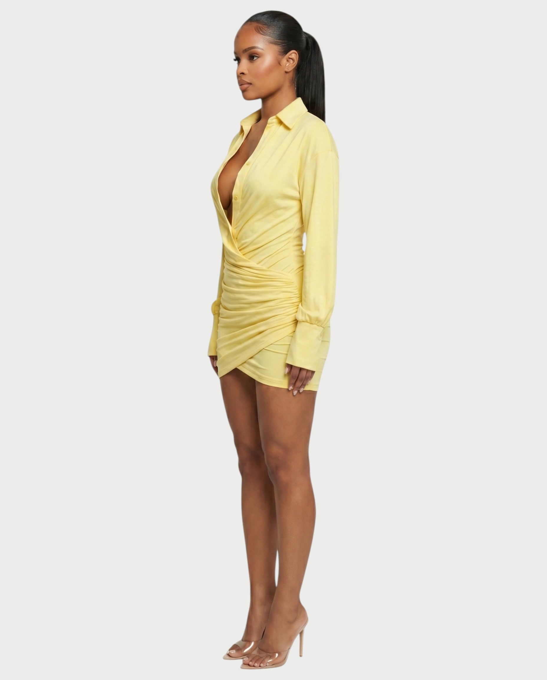 Step into sleek confidence with the Almina Dress, designed to hug your curves in all the right places. Featuring a plunging wrap-style bodice and structured shirt collar. The ruched detailing sculpts the waist and hips, while the soft stretch fabric keeps it effortlessly flattering.
