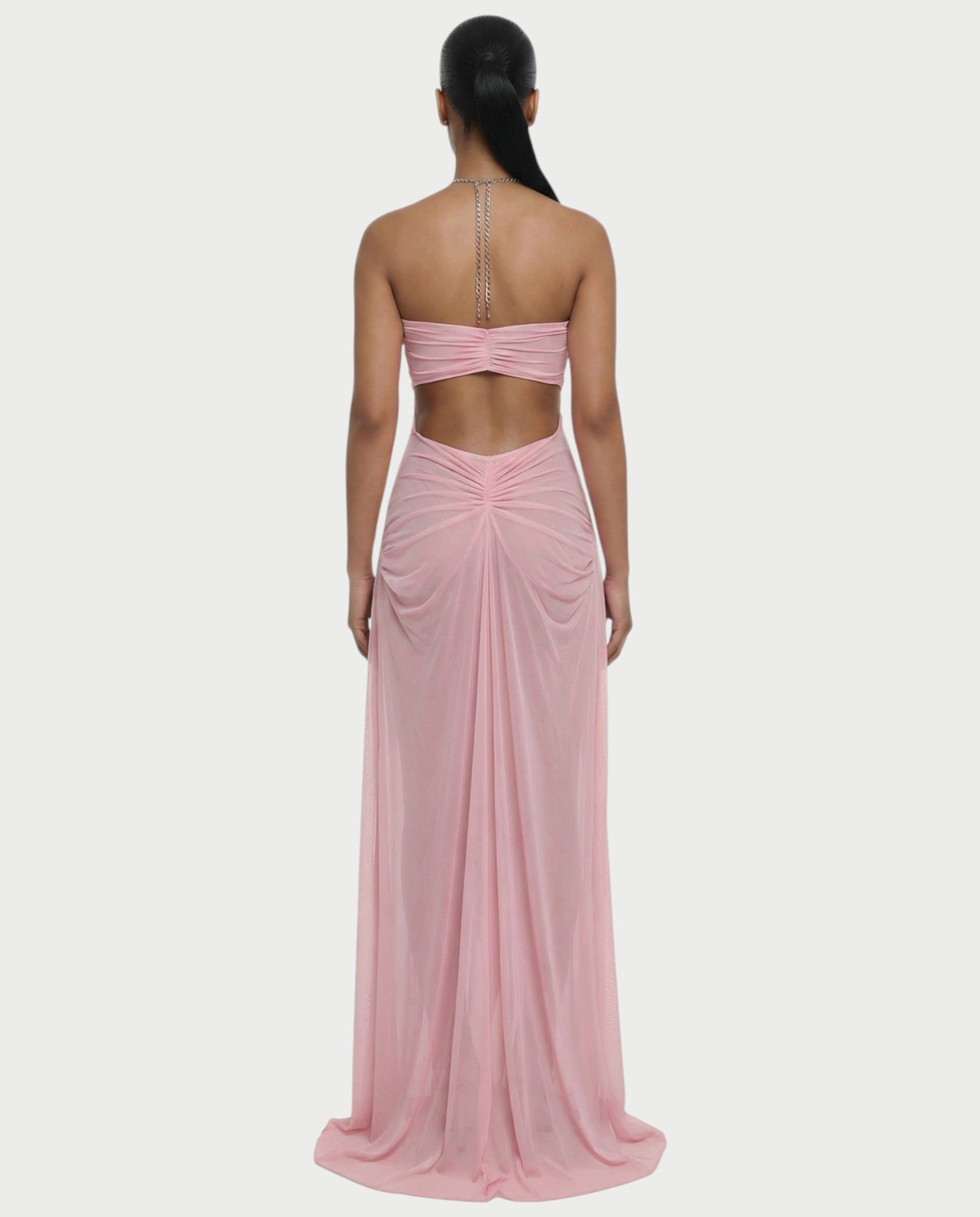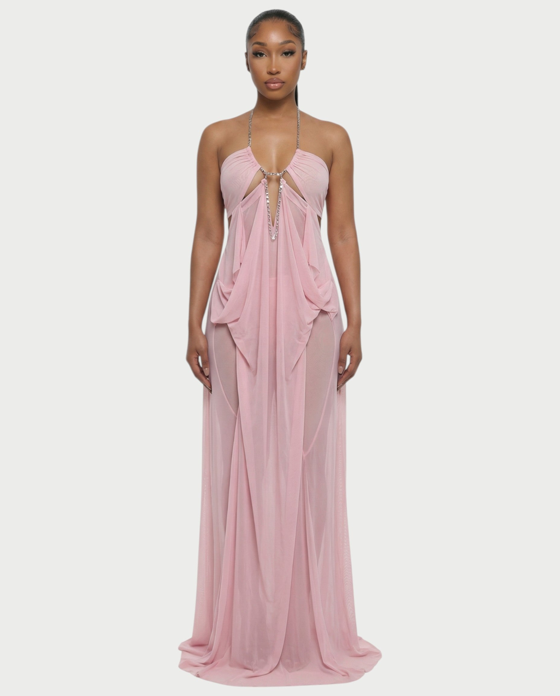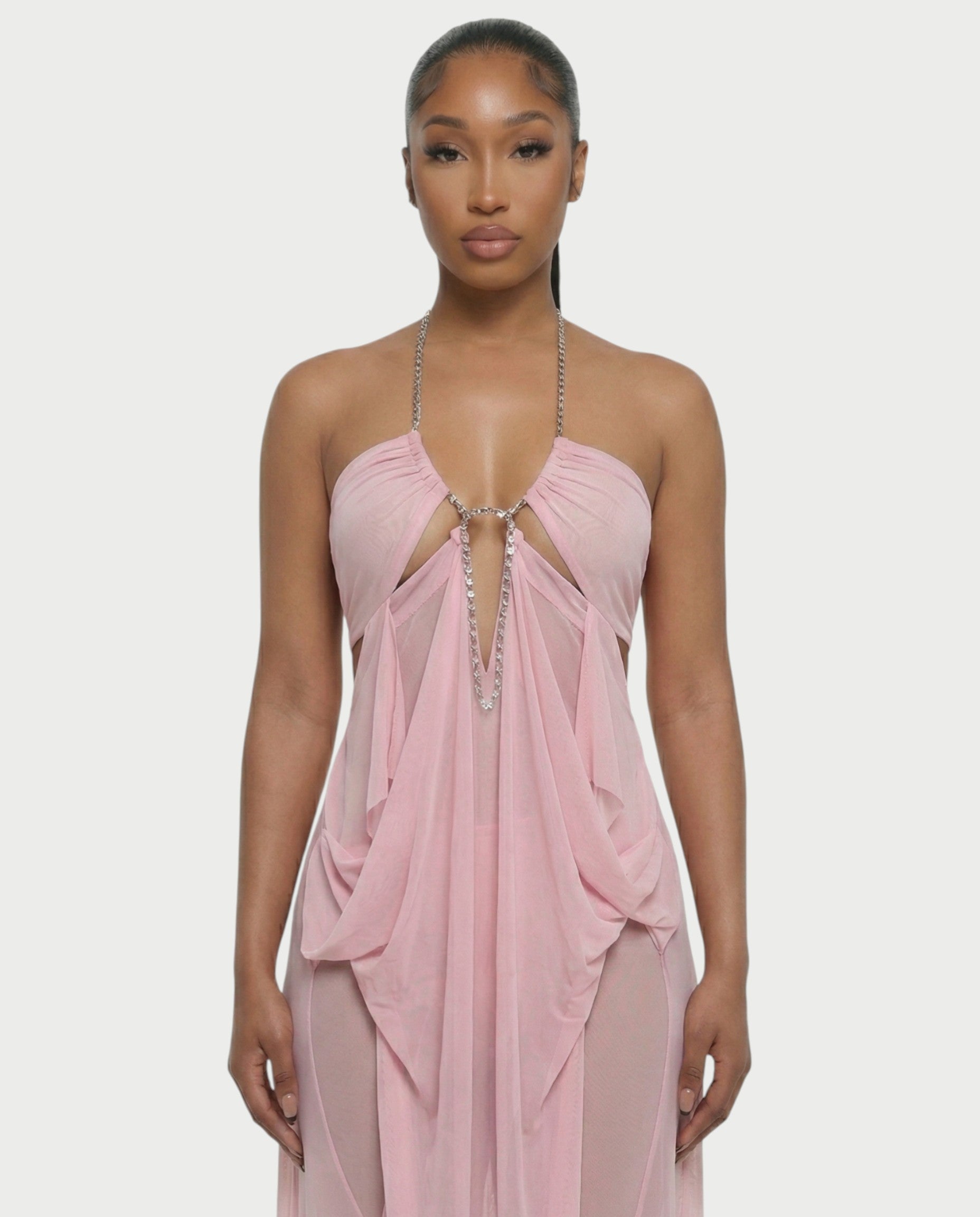 Own the moment in the Aluma Dress. This statement piece features a draped sheer silhouette that moves effortlessly with every step, paired with a bold chain halter neckline that draws all eyes in. Strategic cutouts and a gathered back detail sculpt the body while keeping the look fluid and elevated. Lightweight and airy, it’s all about soft movement with a striking edge.