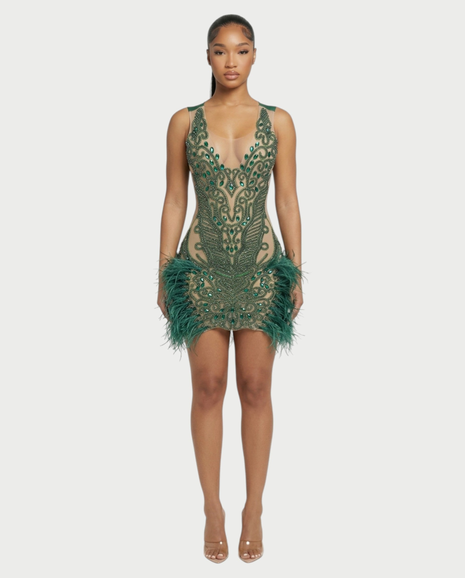 This Feather Trim Mini Dress is designed to make a bold statement with luxurious texture and radiant detailing. Featuring a sheer illusion bodice adorned with intricate emerald crystal embellishments, this sculpted mini dress highlights the figure with striking artistry. The hem is finished with dramatic feather trim accents that add movement and a glamorous finish, while the sleek fitted back creates a smooth, elegant silhouette.