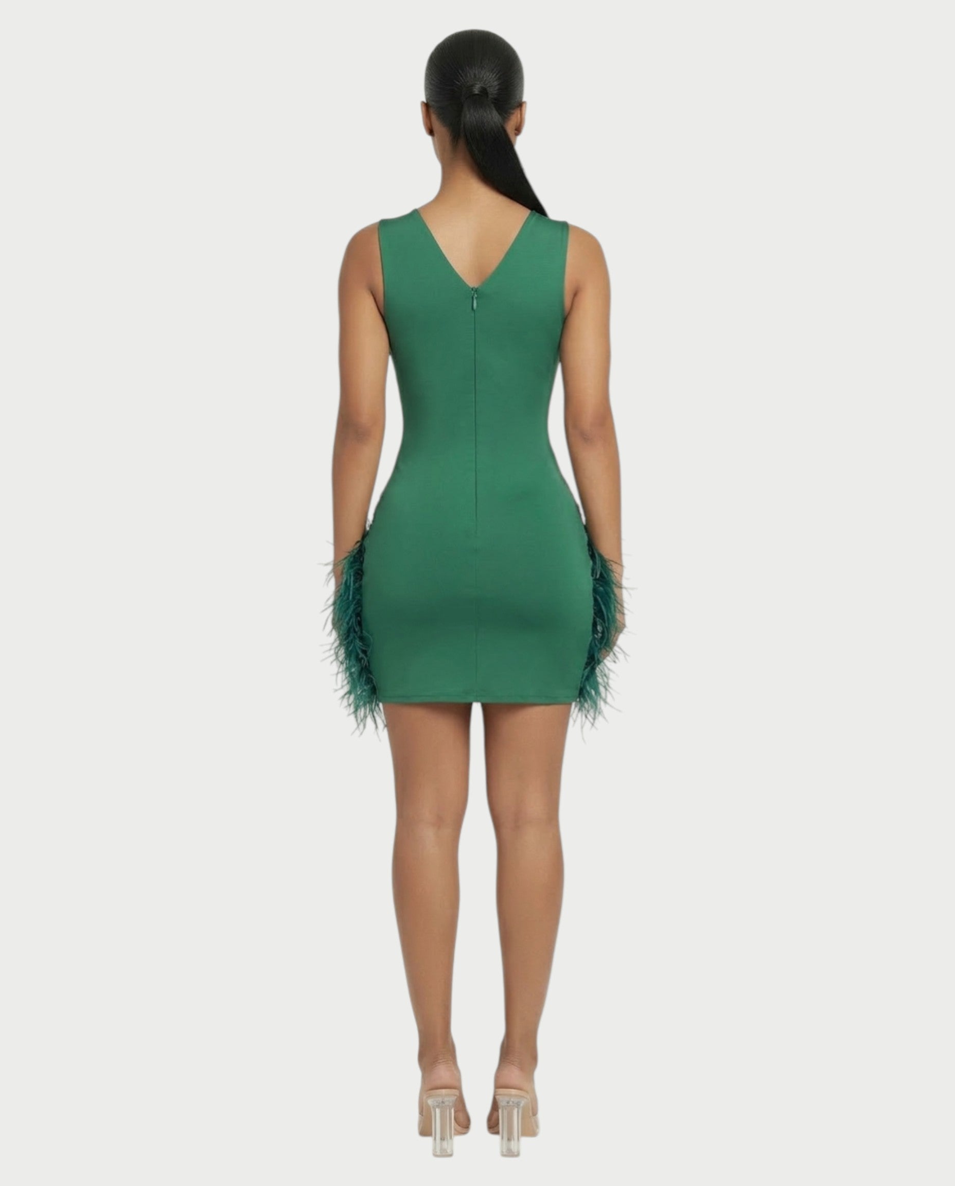DARIA Emerald Crystal Feather Trim Mini Dress