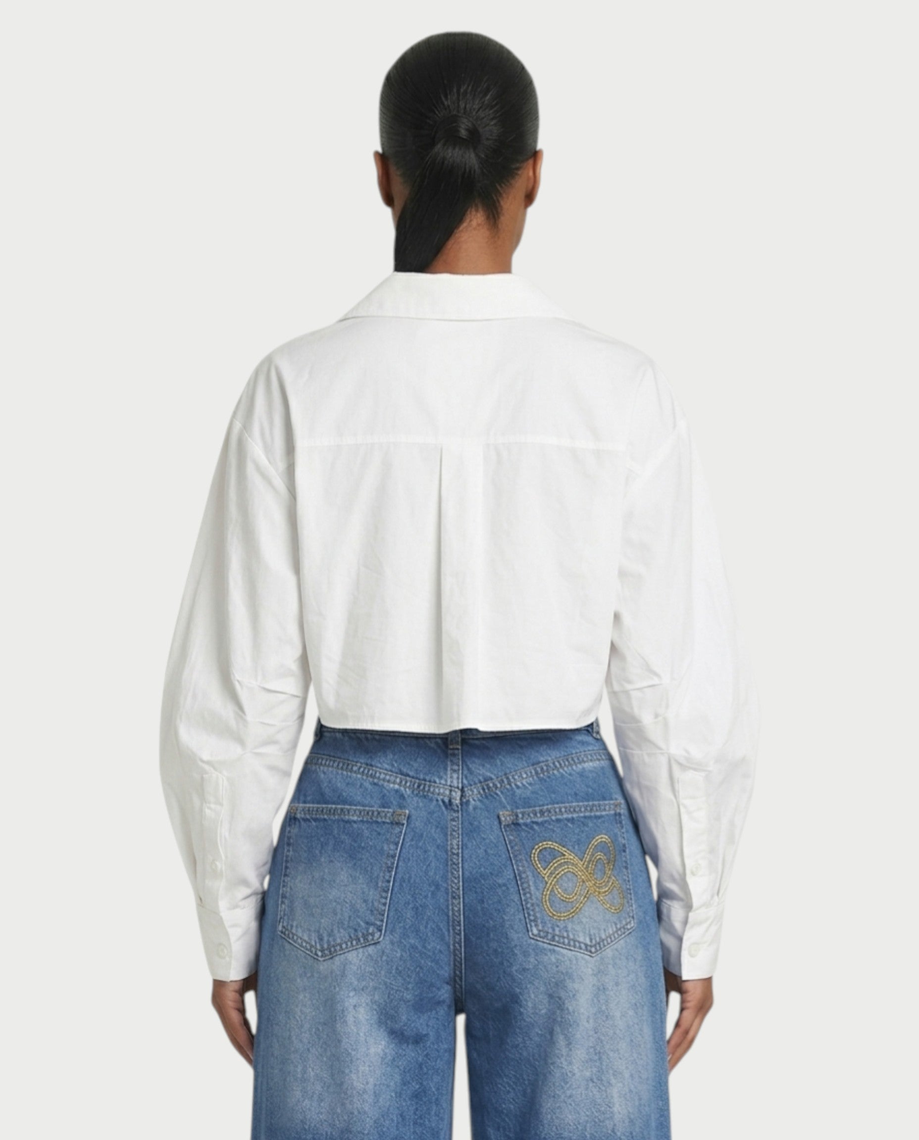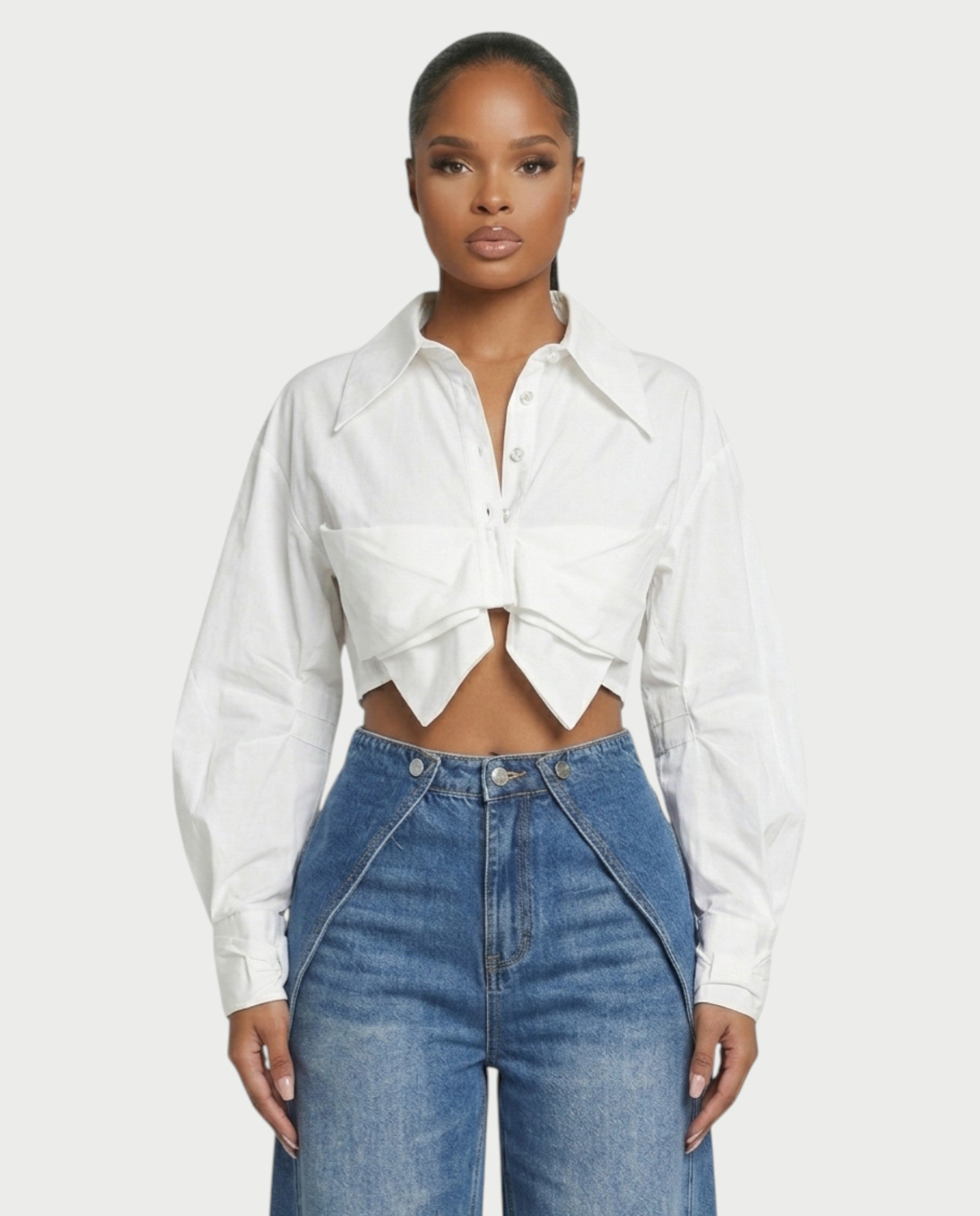 The Orly top features a sharp collar and structured long sleeves, finished with a sculpted front that folds into a striking twist detail. The cropped length highlights the waist while the tailored shape keeps the look clean and elevated. A modern take on a classic button-up with an unexpected edge.