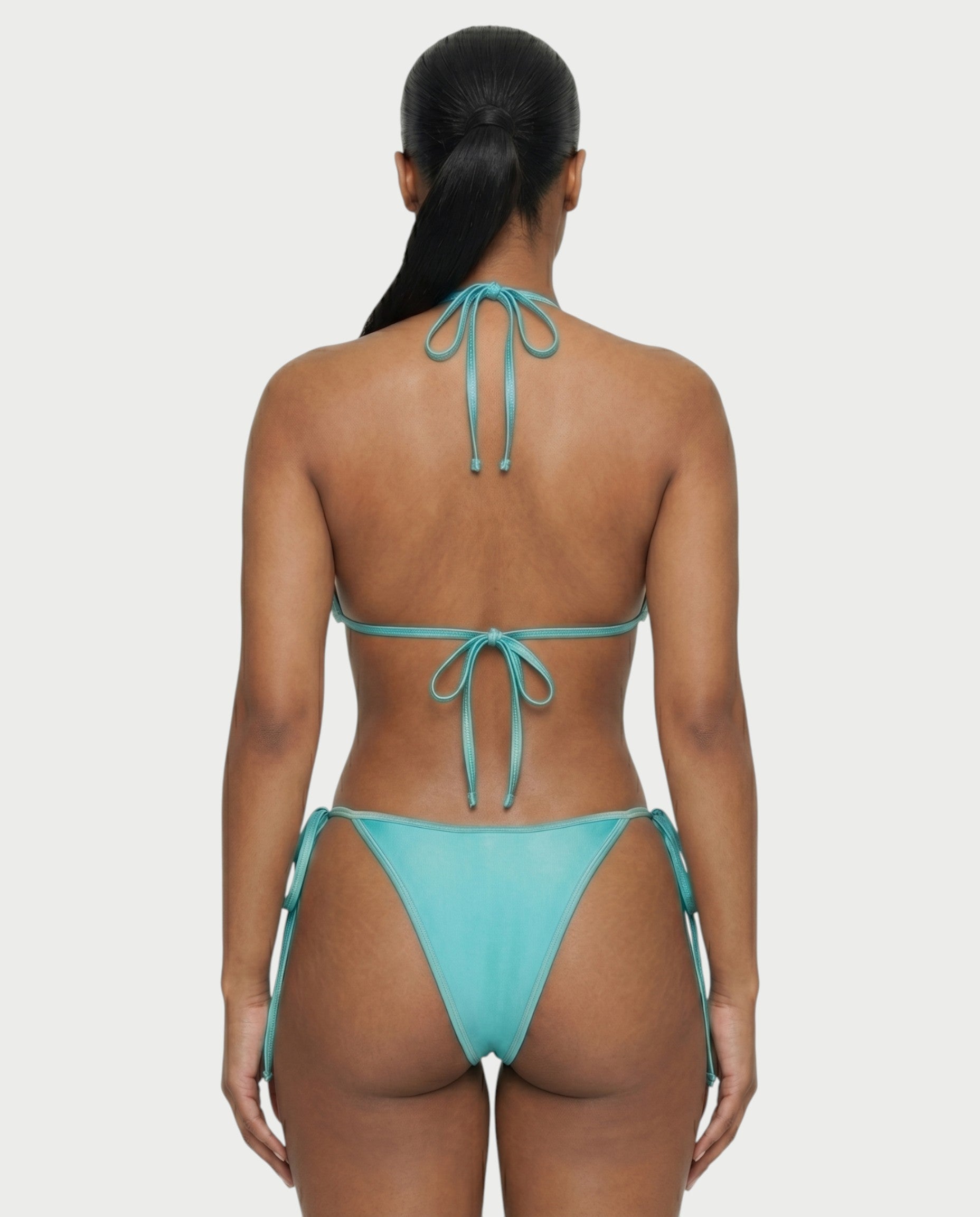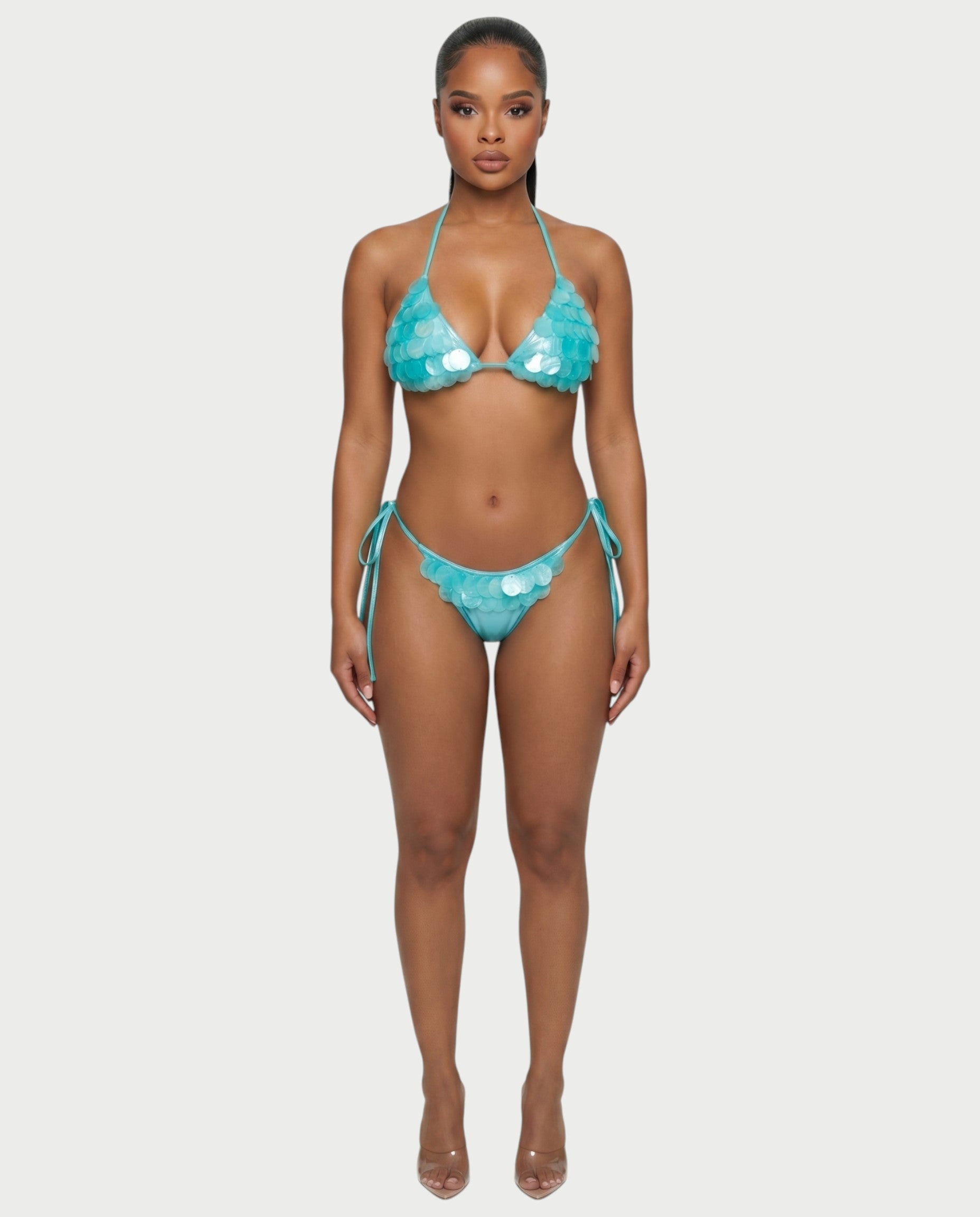 Make waves in the Rivena Bikini Set, designed with eye-catching texture. This flirty two-piece features a classic triangle top adorned with layered shell-like sequins that shimmer with every move. Paired with a matching tie-side bottom, it hugs just right while keeping things playful and bold.