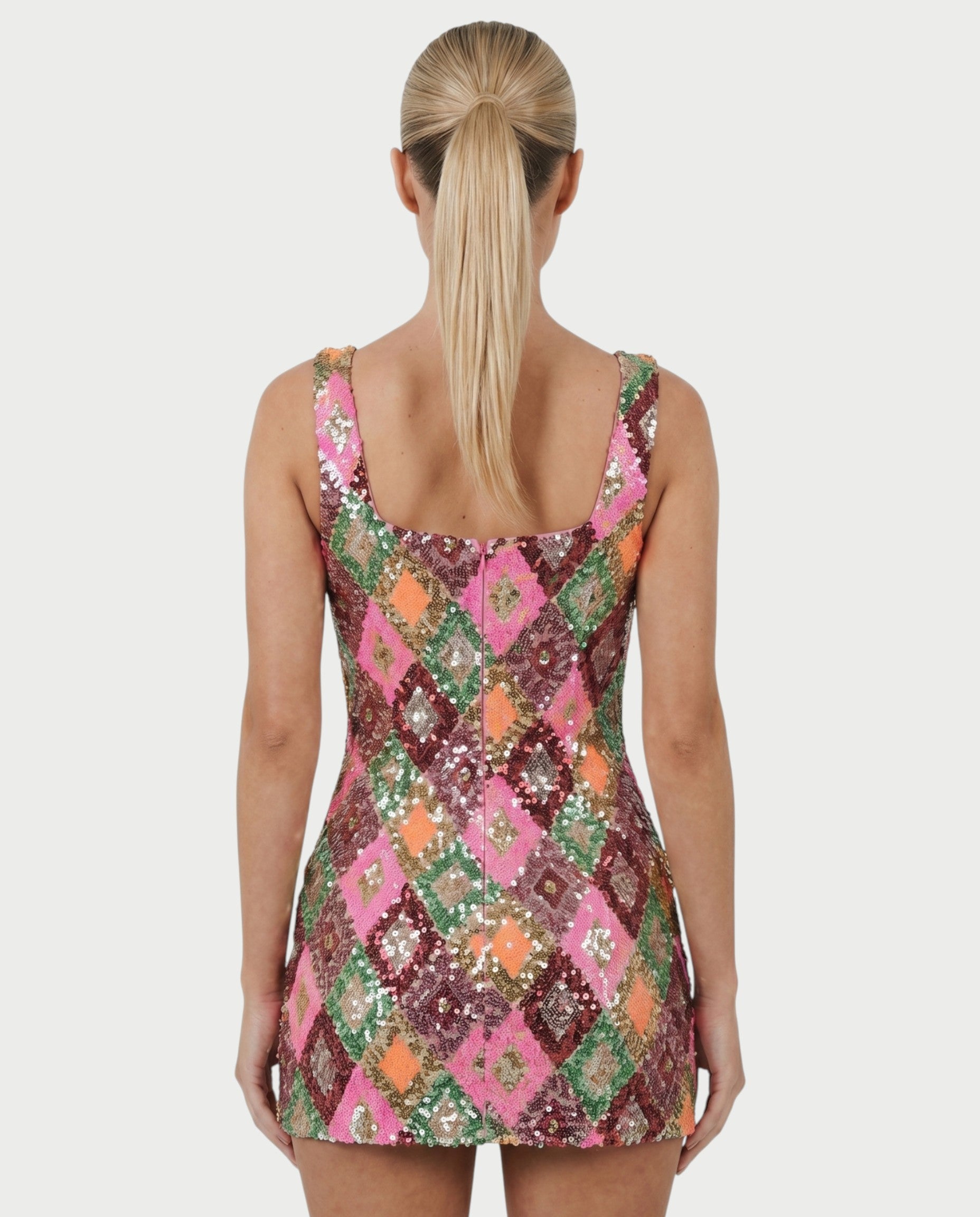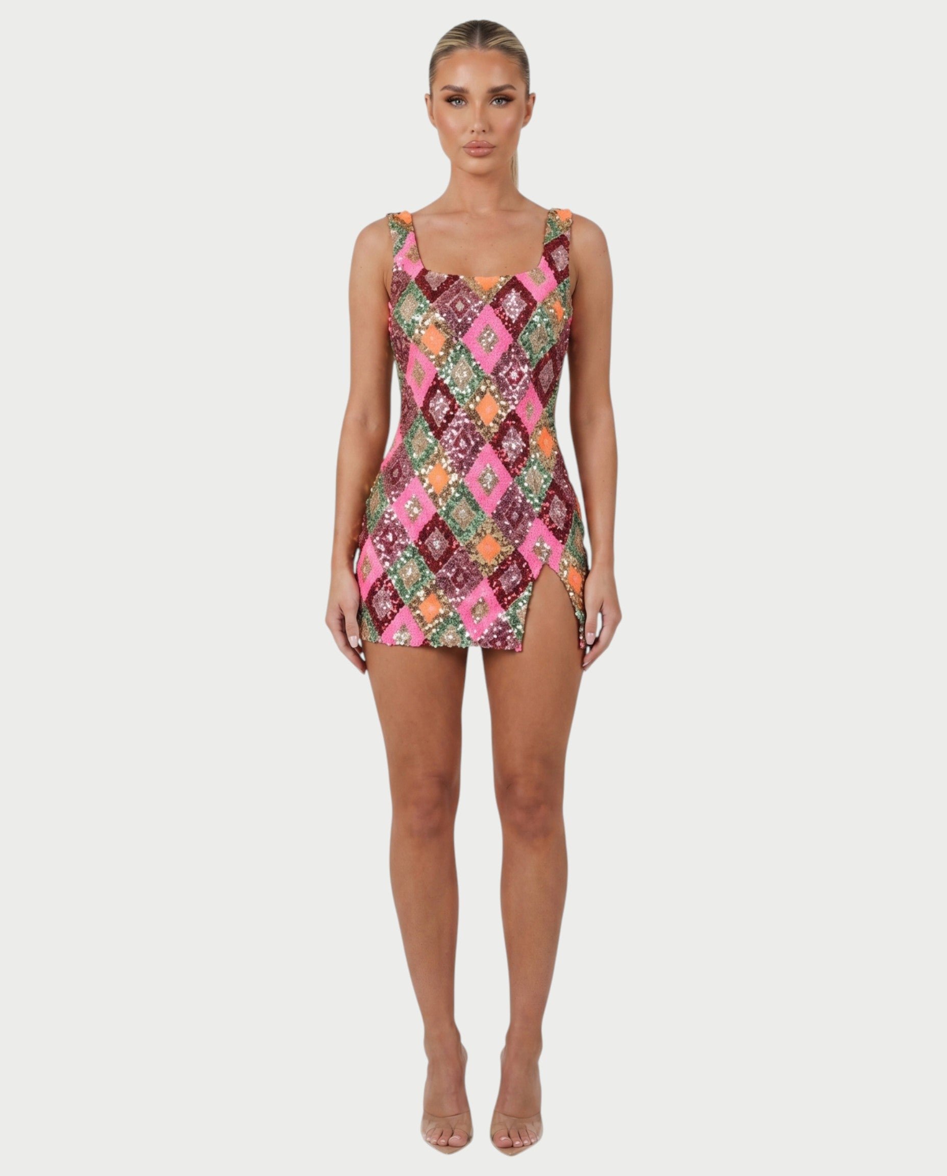SAKIRA Pink Green Sequin Diamond Bodycon Mini Dress
