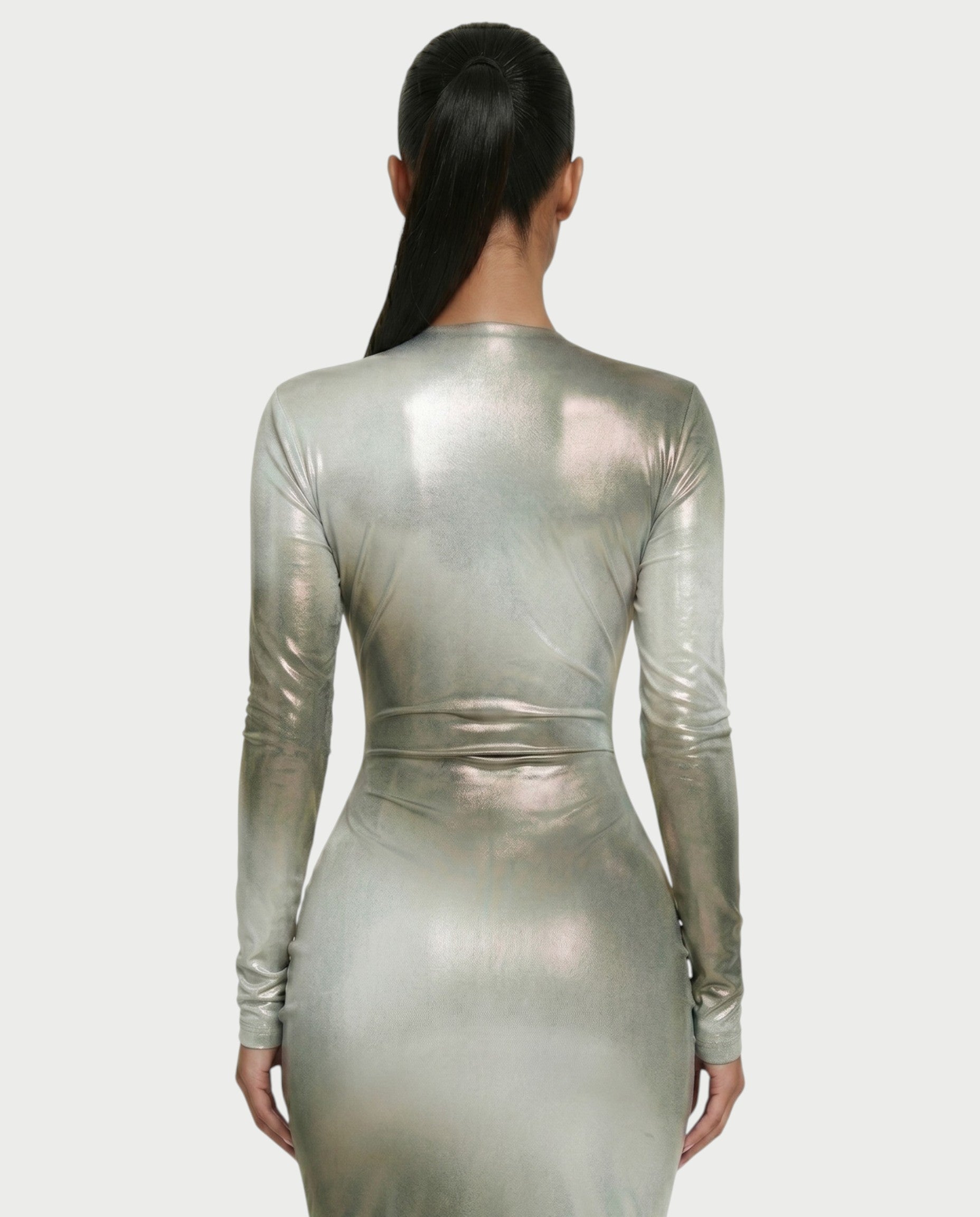 Turn up the drama in the Samina Dress, designed to sculpt and shine from every angle. Featuring an ultra-deep plunge neckline and sleek long sleeves, this piece hugs the body with a smooth, stretch finish. The gathered waist detail and cascading drape add dimension, while the high slit brings just the right amount of edge.