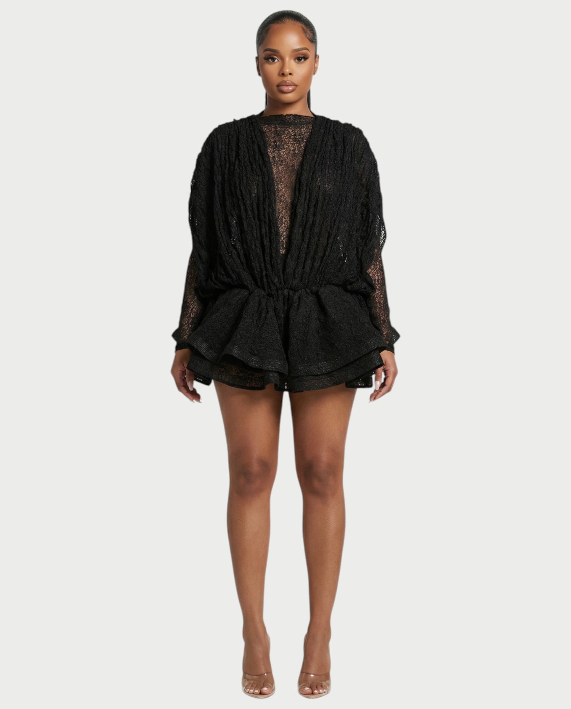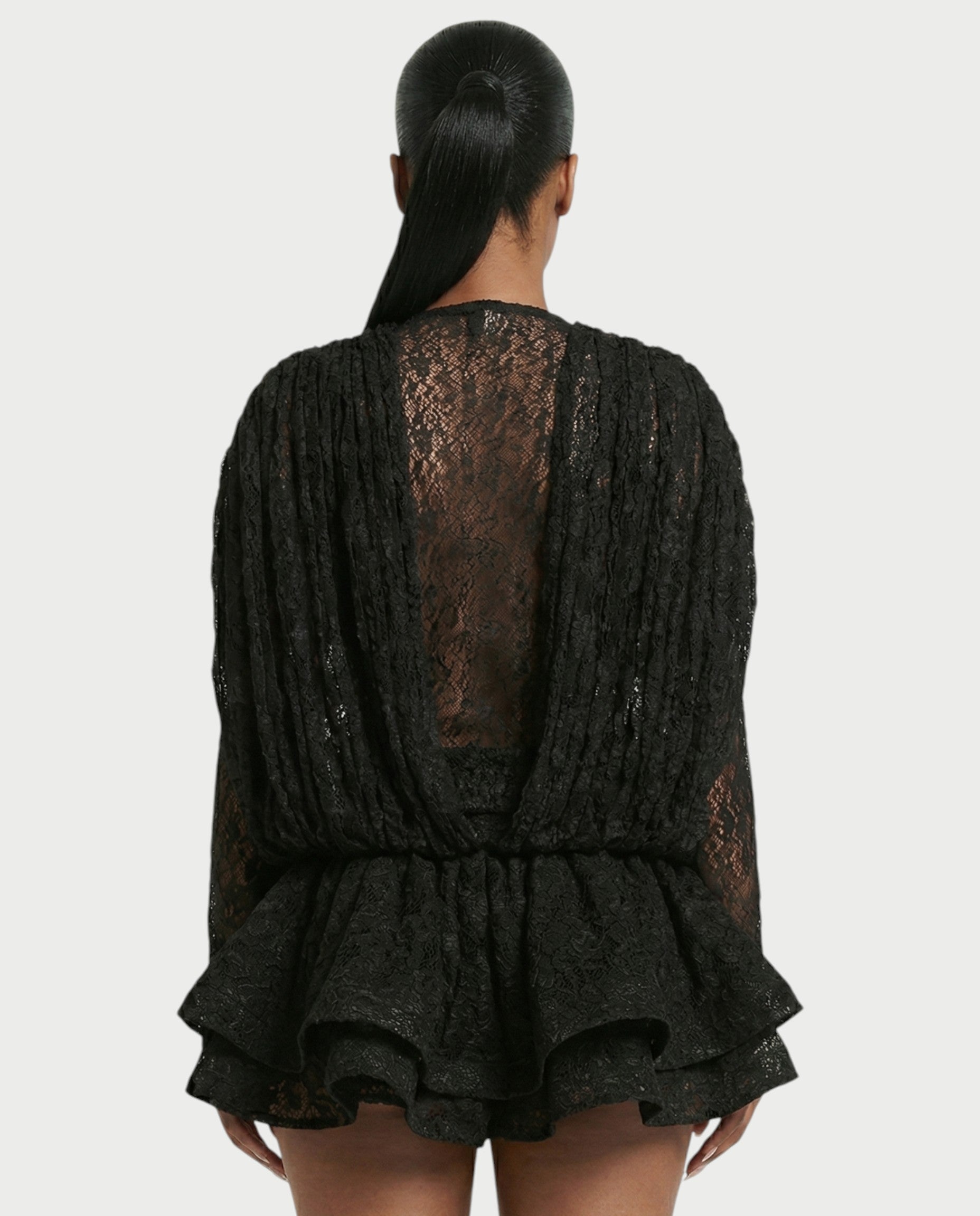 Own the moment in the Sorya Dress. A romantic lace mini dress with a high neckline, long sheer sleeves, and a dramatic plunging draped front that creates a soft, sculpted shape. The waist is softly defined before falling into a layered ruffle hem that adds volume and movement, while built-in shorts underneath provide extra coverage and a secure, comfortable fit.
