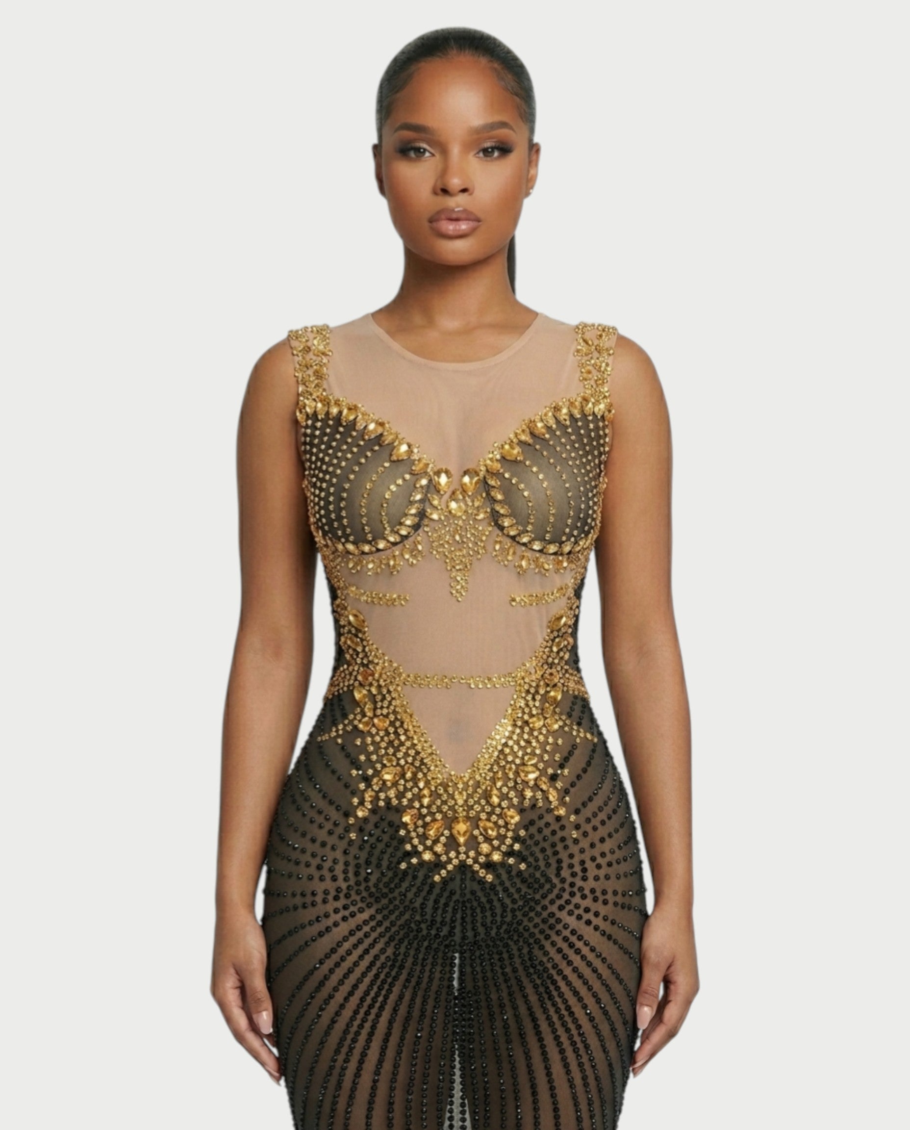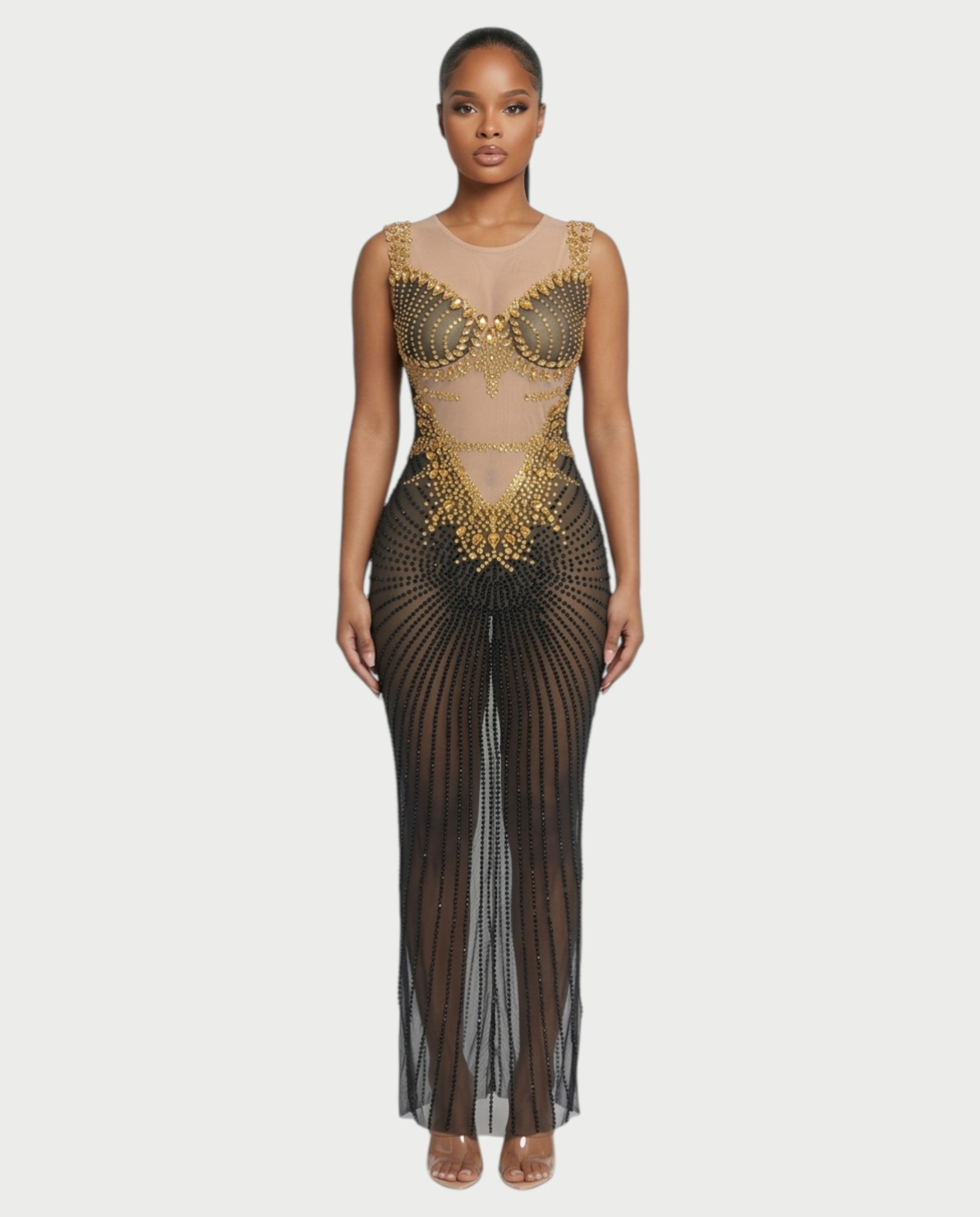Designed with a sheer mesh silhouette, this striking gown features radiant gold crystal detailing across the bodice that transitions into cascading black crystal lines through the skirt. The illusion panels sculpt the waist while the fitted maxi silhouette elongates the figure for a dramatic evening look. Finished with a sleek back zipper and elegant V-back design for a refined finish.