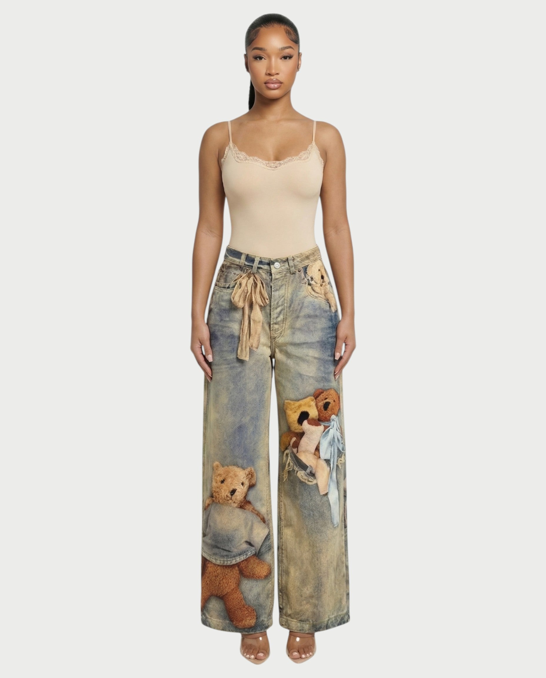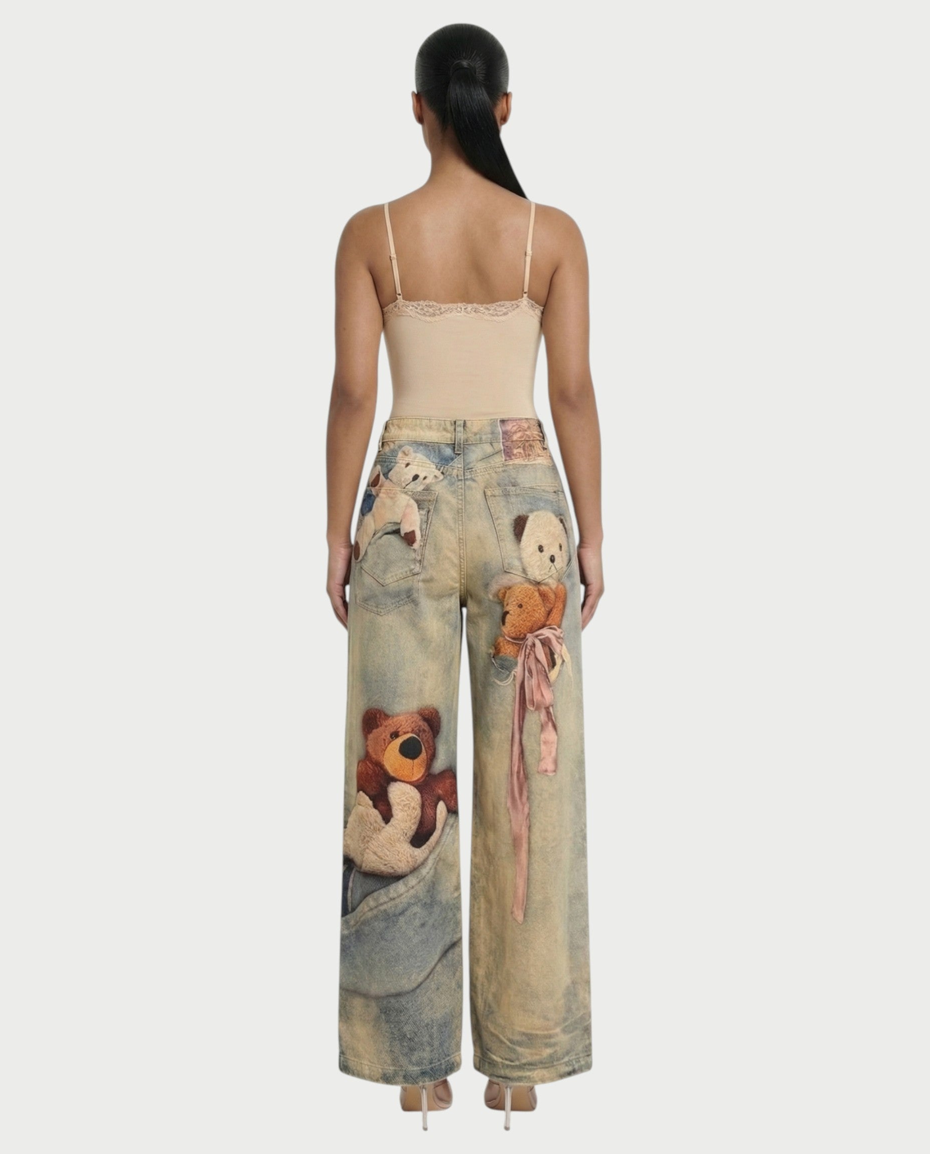 VASHA Teddy Bear Print Wide-Leg Denim Pants