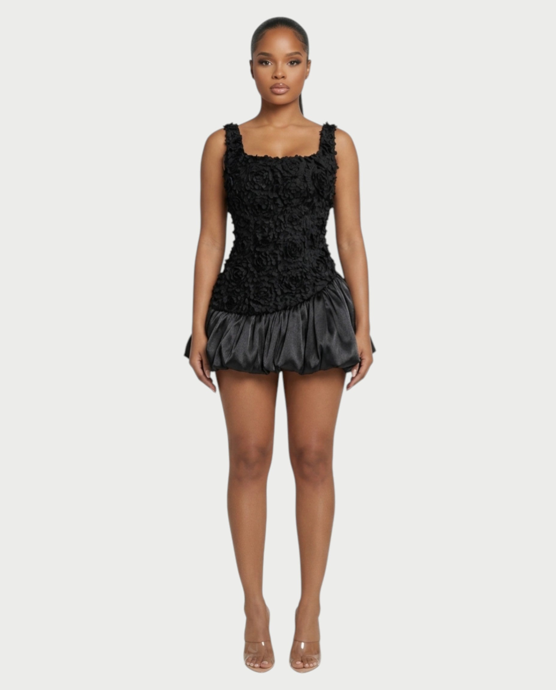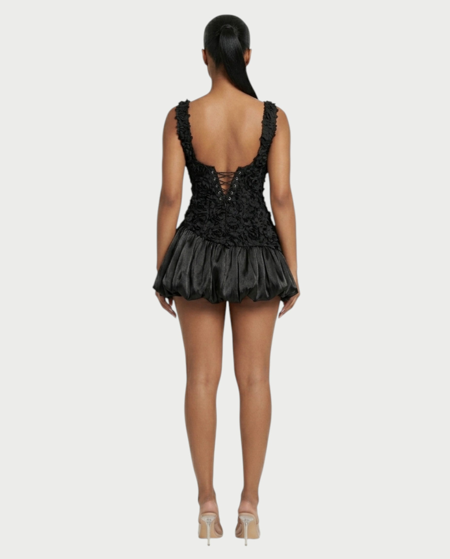 This mini dress features a fitted bodice covered in dimensional floral appliqué that contours the shape, balanced by a dramatic bubble-style hem. Thick straps and a softly curved neckline keep the look structured, while the lace-up back adds an adjustable, corset-inspired touch. Hidden underneath, matching shorts provide comfort without compromising the statement silhouette.