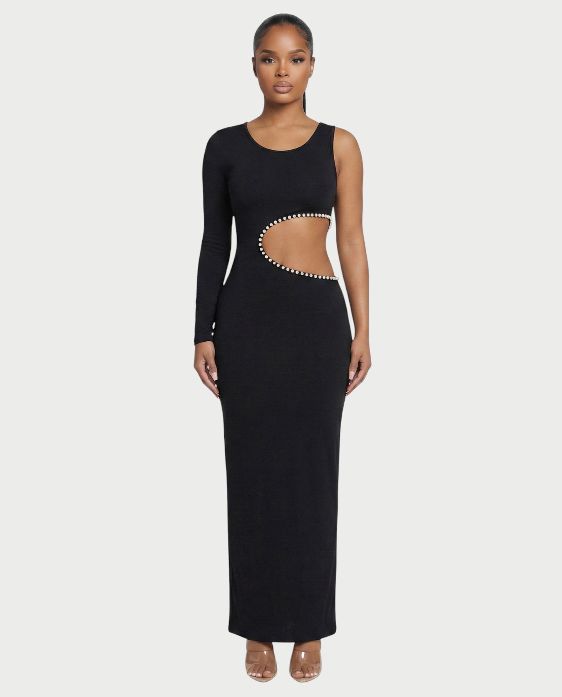 Make a sophisticated statement in the Bellia Maxi Dress, designed to captivate with its elegant yet daring details. This dress features a sleek, one-sleeve silhouette with a bold asymmetrical cutout on the side, exquisitely adorned with shimmering pearl embellishments. Crafted for a flattering bodycon fit.