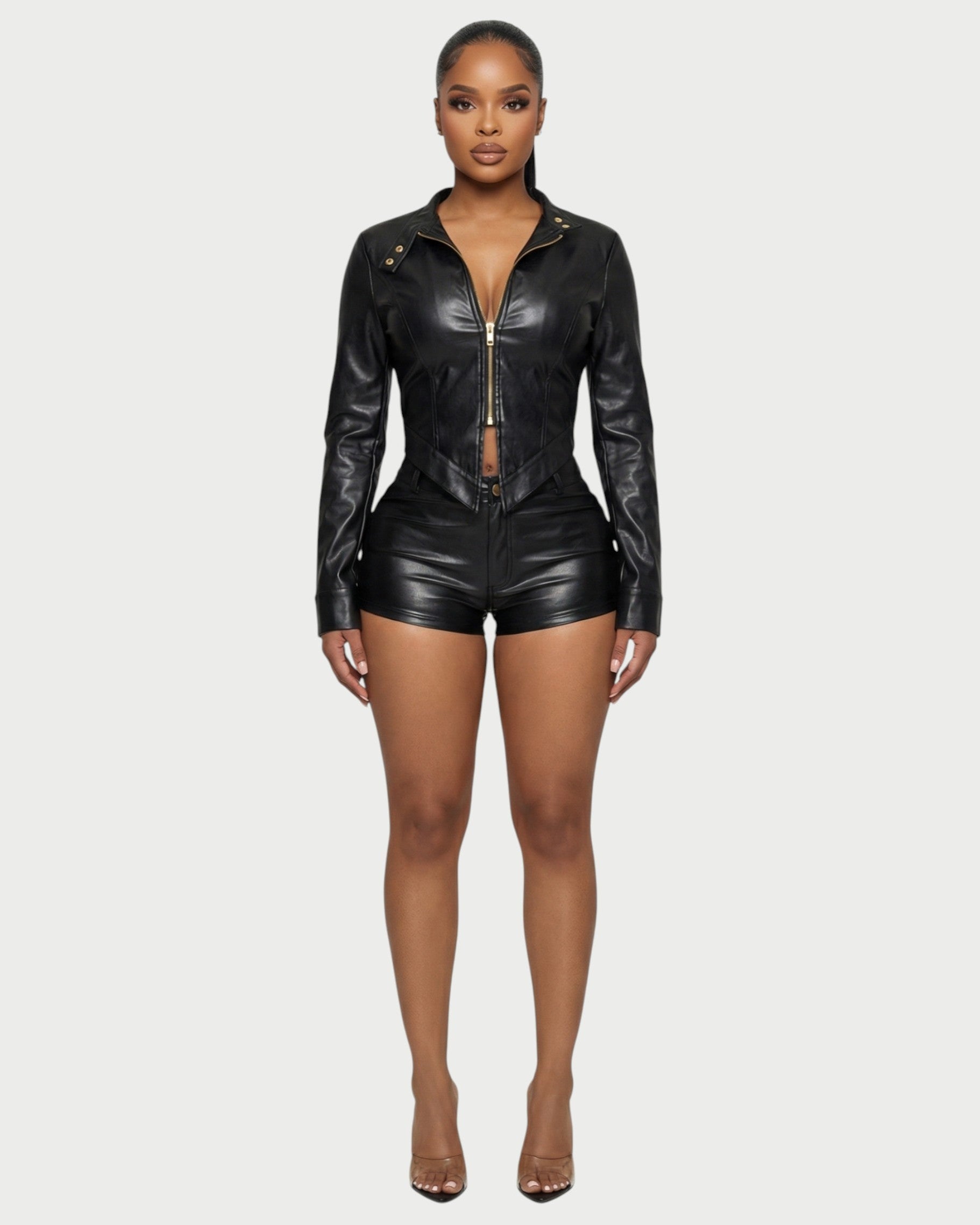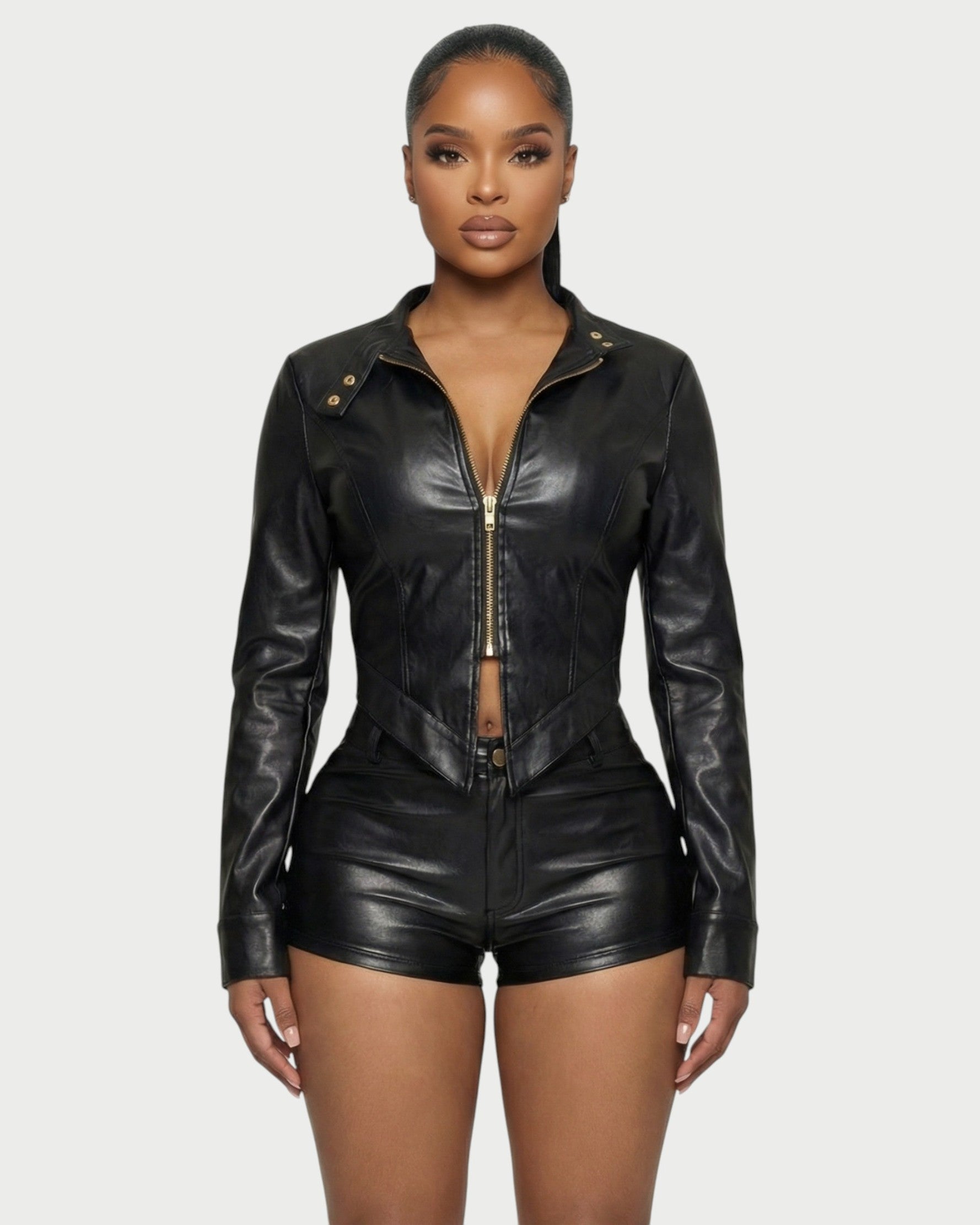Turn up the edge in the Brixa Set, designed to hug every curve with a sleek, sculpted leather finish. The fitted zip-front jacket features sharp seam detailing and a snatched waist, while the high-waist shorts contour the hips with a smooth, second-skin feel. Crafted from a structured leather-look fabric with subtle stretch.