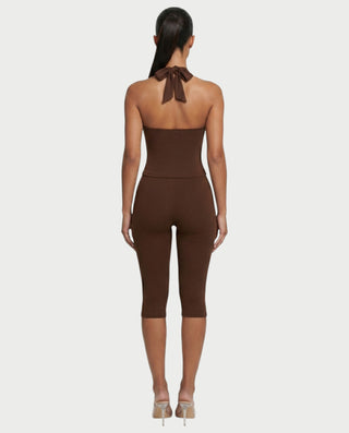 Introducing Relani, the ultimate statement jumpsuit-meets-bodysuit silhouette. Designed to look like a seamless fusion of high-cut bodysuit and second-skin tights, this piece is bold, sleek, and futuristic. The rich mocha tone enhances the body-hugging stretch fabric, while the dramatic draped shoulder cape adds elegance and drama.