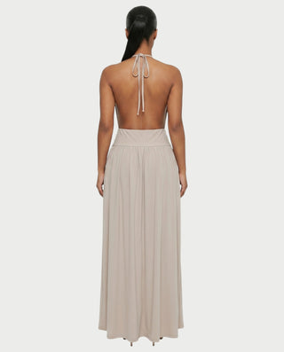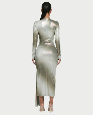 SAMINA Metallic Deep Plunge High Slit Maxi Dress