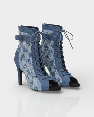 REIKO Buckled Ankle Strap Lace-Up Denim Boots