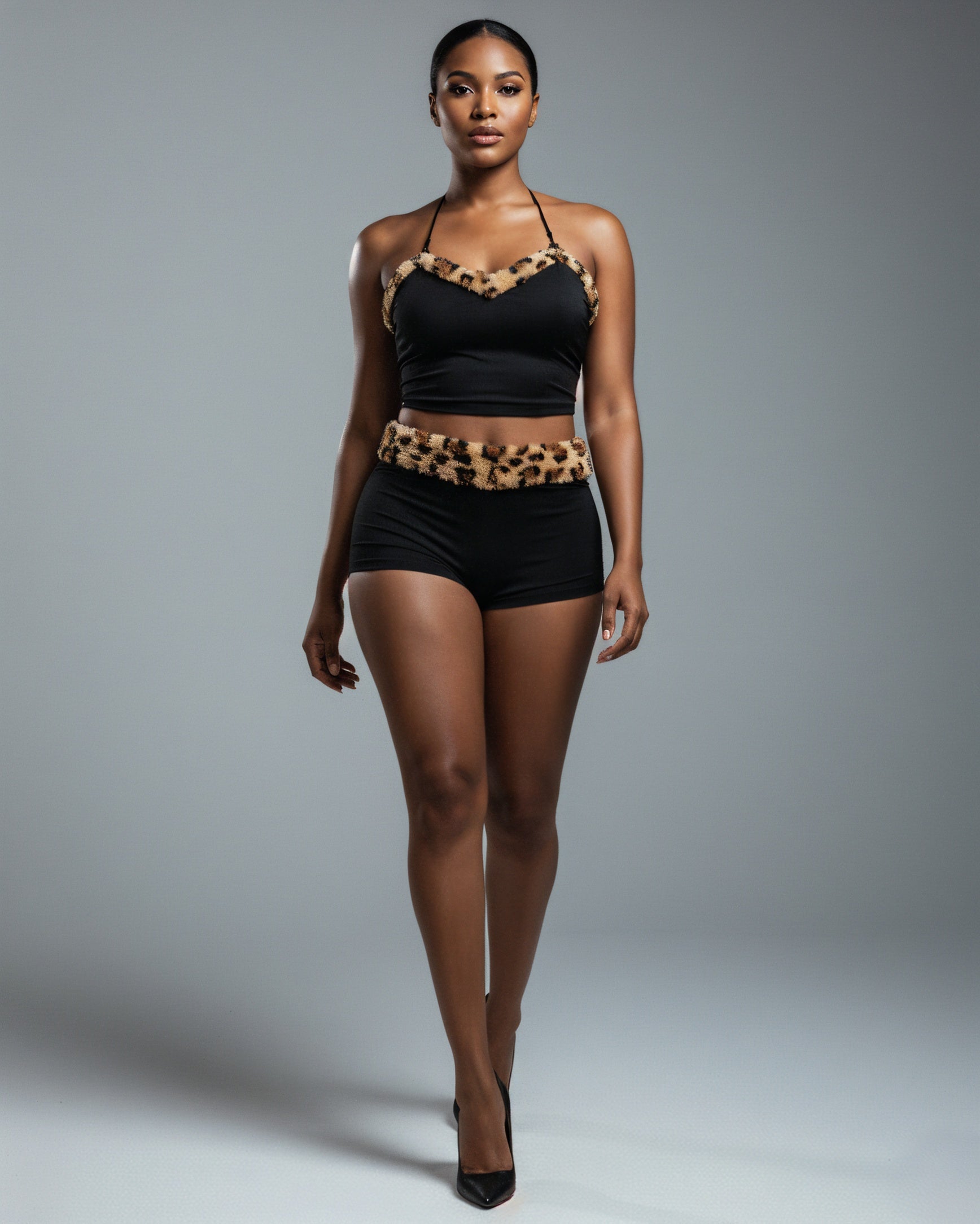 This two-piece set features a sleek halter-style crop top with adjustable tie straps, accentuated by plush leopard fur trim along the neckline. The matching high-cut shorts hug your curves in all the right places, with a coordinating leopard fur waistband.