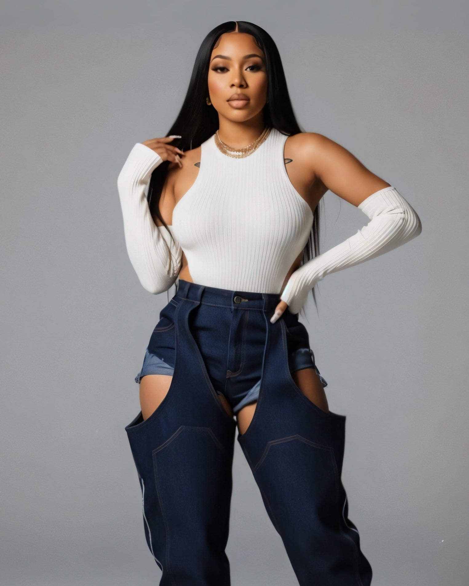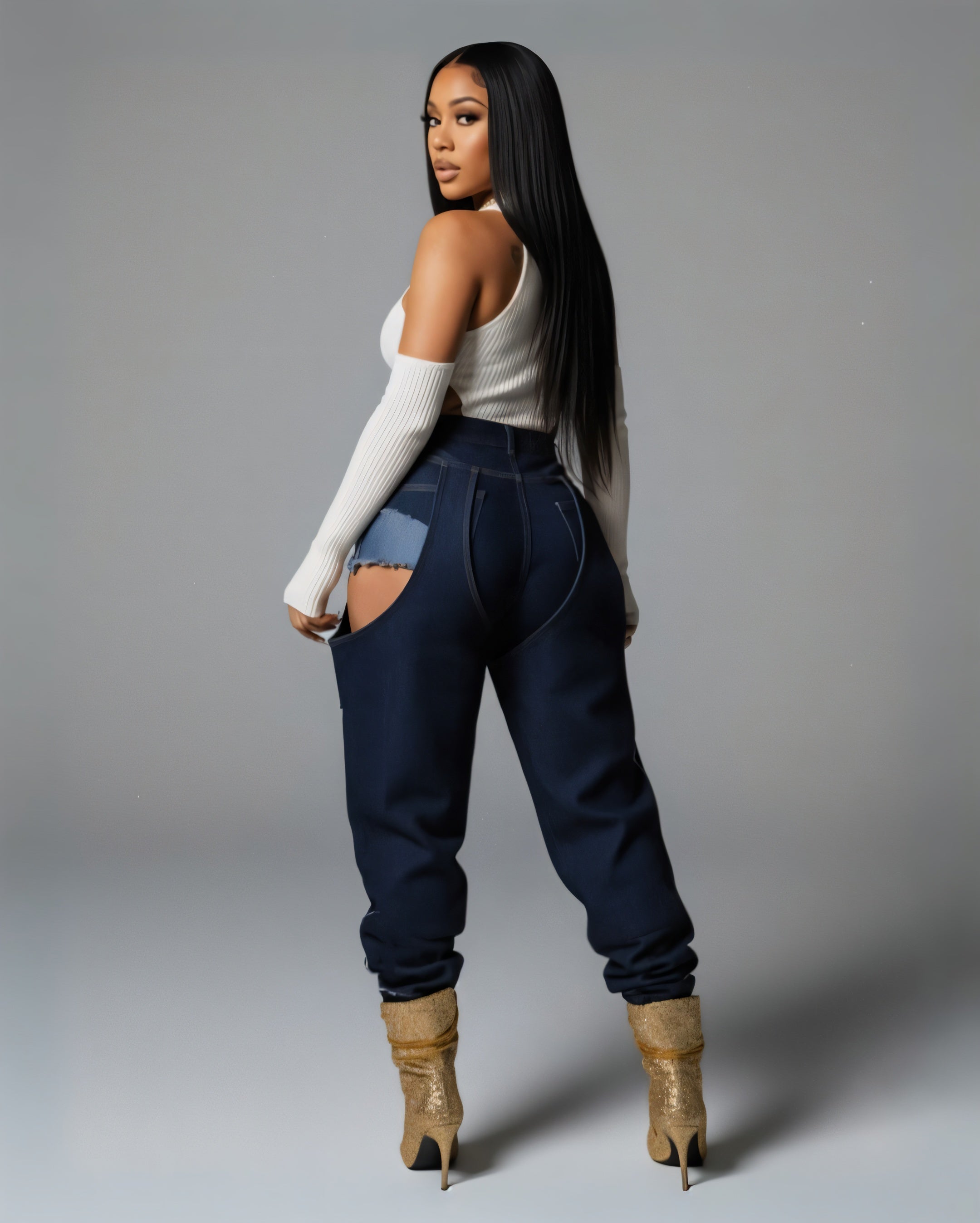 A bold reinvention of denim, the Niami pants fuse streetwear with sultry edge. Featuring oversized cutouts at the hips, layered over mini denim shorts. Crafted from structured dark-wash denim, these pants also feature exaggerated pockets and adjustable ankle zips for customizable flair and function.