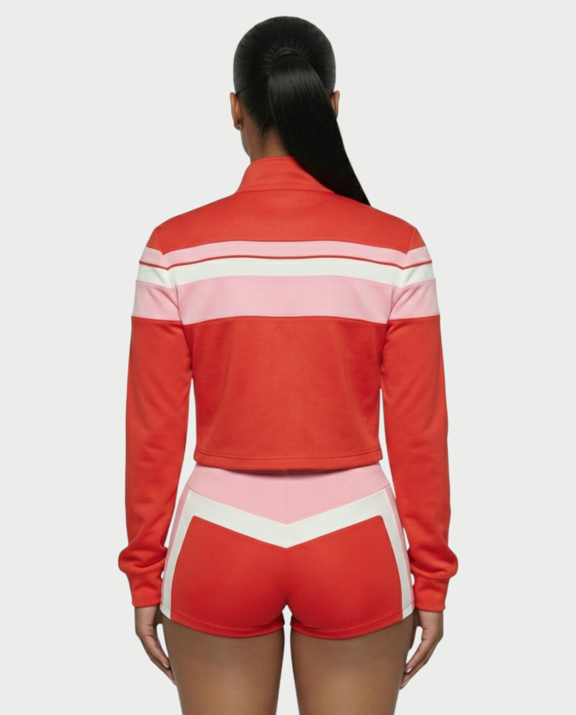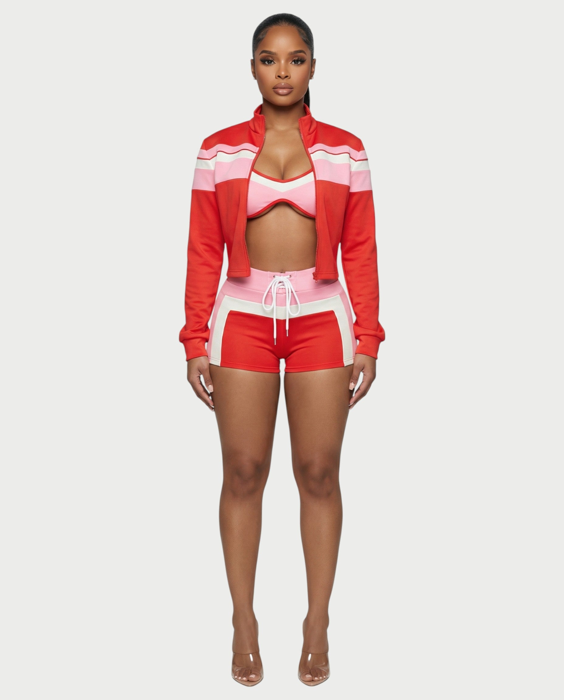 Este conjunto deportivo de tres piezas te da una energía atrevida con un toque retro. Con una chaqueta corta con cremallera, escote pronunciado, ribetes en contraste y cuello alto, se combina fácilmente con un top de bikini estilo halter. Los shorts de cintura alta a juego incluyen un detalle de cordones en la parte delantera y paneles curvos con bloques de color que realzan tu figura.