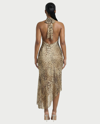 Vestido largo con abertura y cuello halter y estampado de leopardo EMPRESS