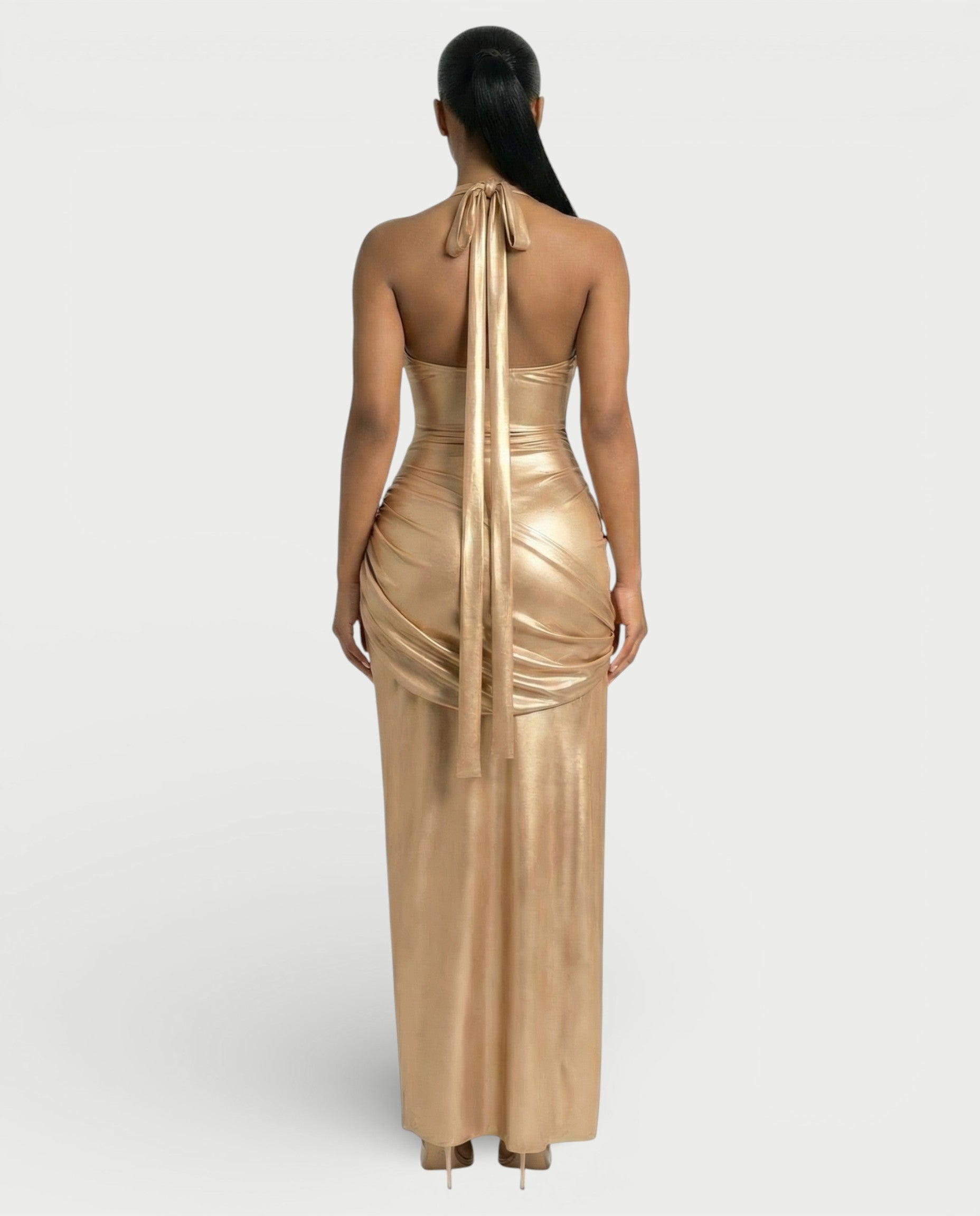 El acabado metálico con brillo líquido se adapta a tu figura, mientras que el escote profundo y la abertura a la altura del muslo le aportan un encanto sin complejos. Los frunces laterales ciñen la cintura para una silueta esculpida e impactante.