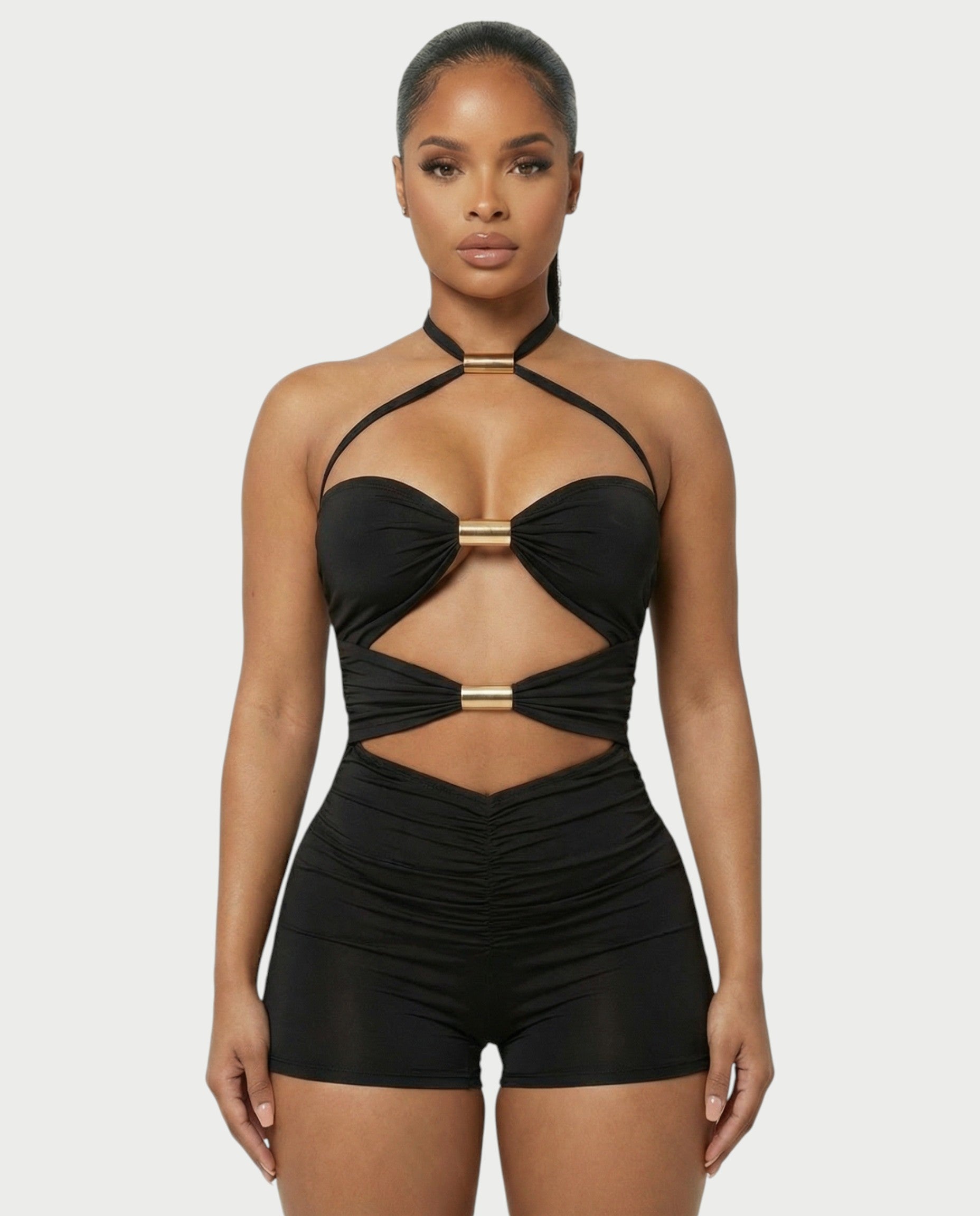 Cuando salgas en ARINA, propio La habitación. Con cortes llamativos, detalles dorados y una silueta que se adapta a cada curva, este mono lleva tu confianza al siguiente nivel.