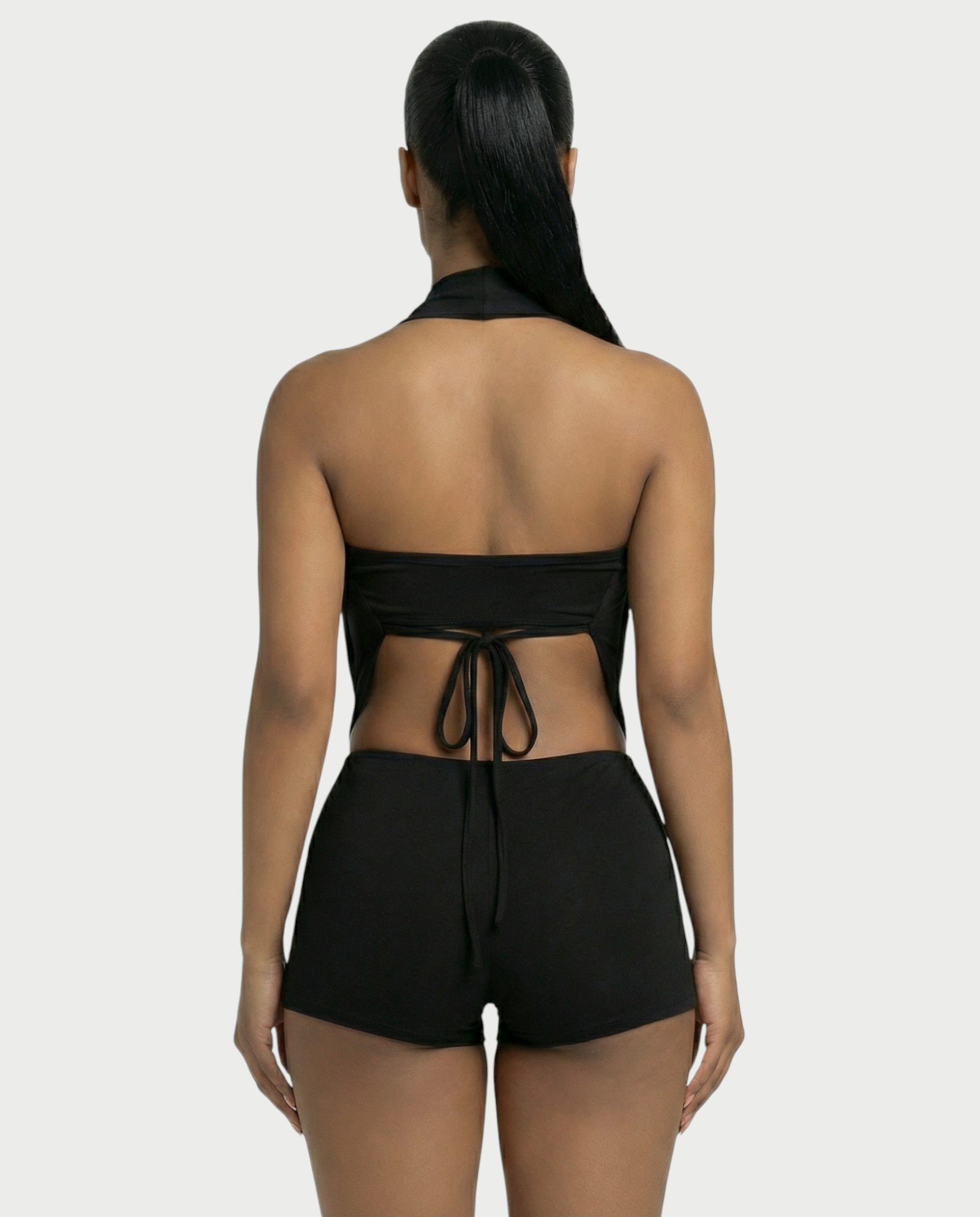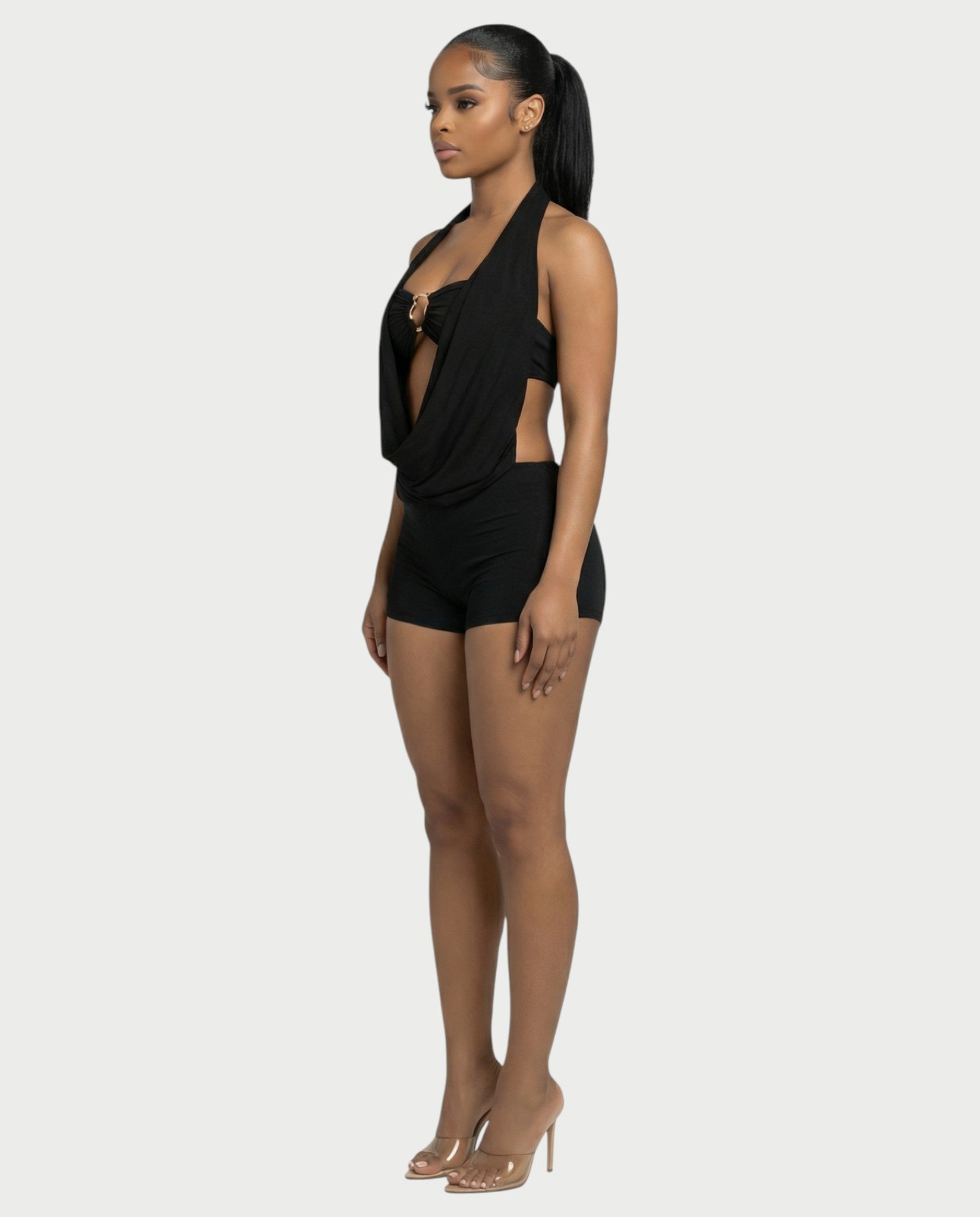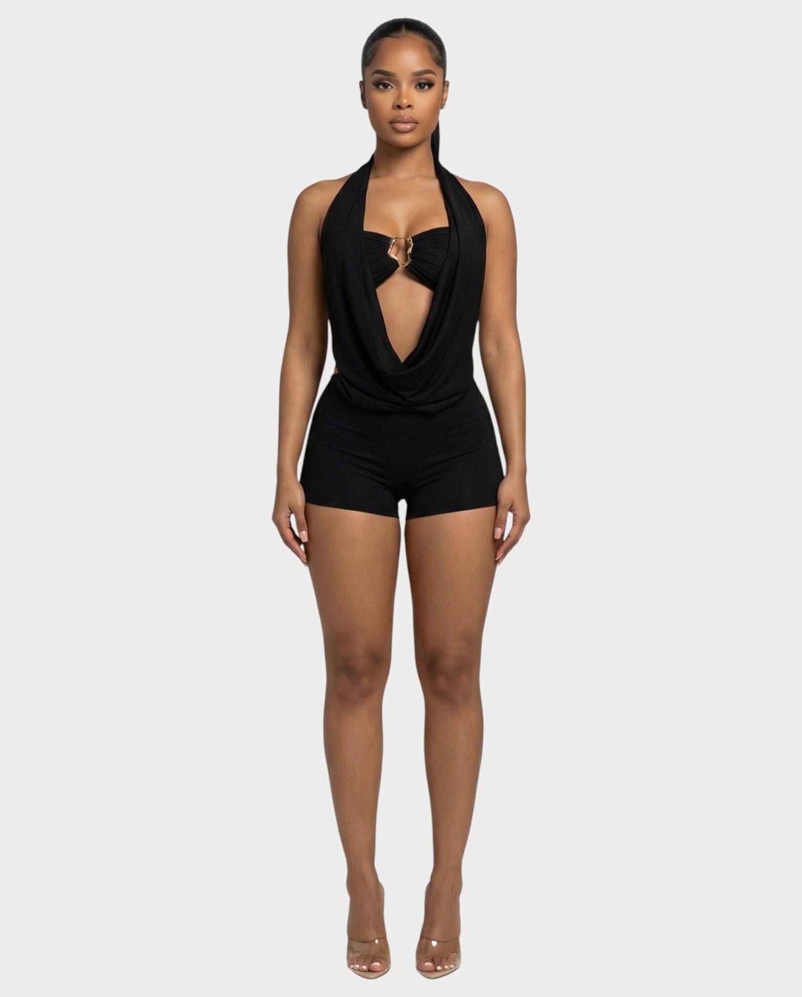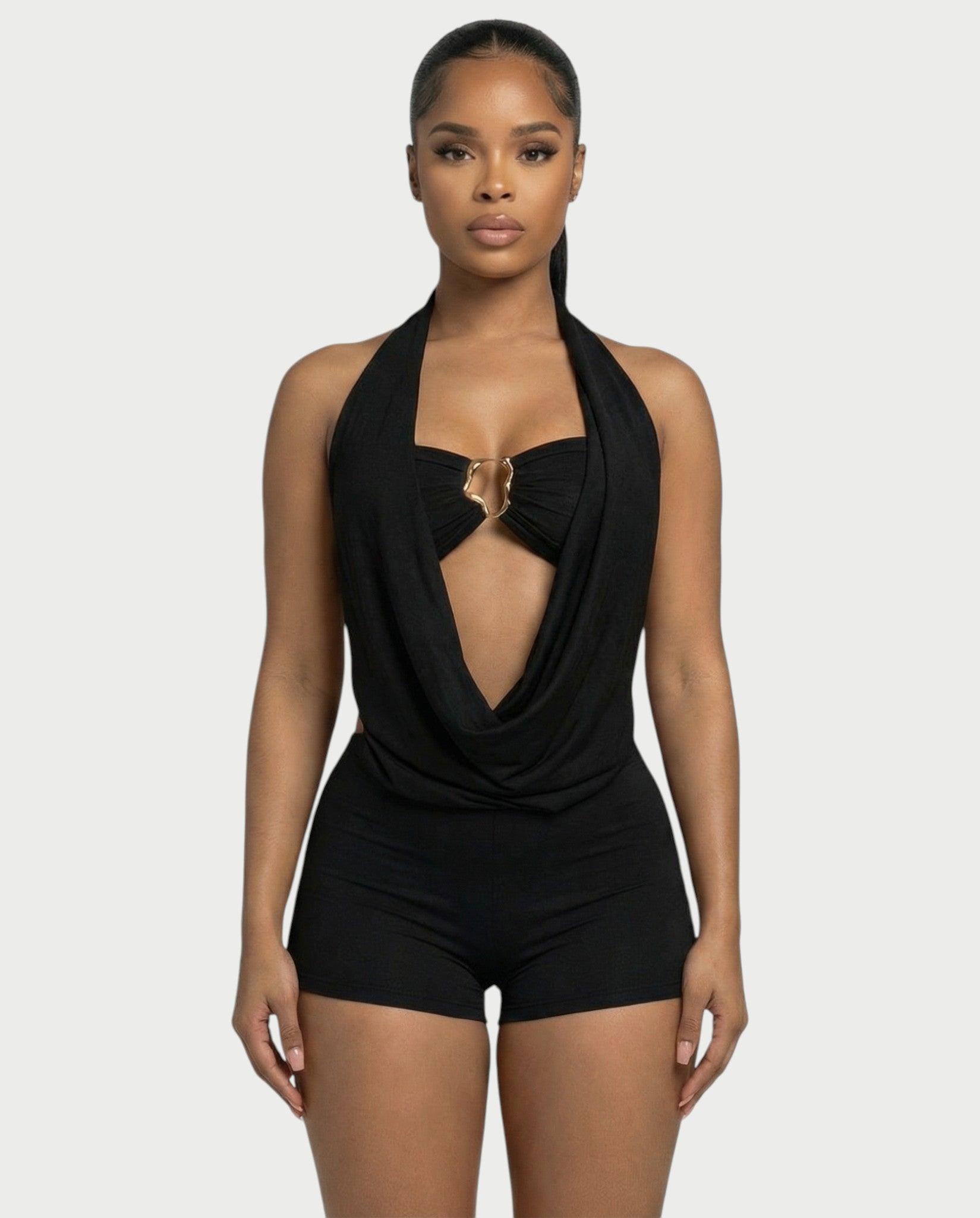Este cautivador conjunto de dos piezas incluye un mono con cuello halter y un escote drapeado espectacular, que revela un elegante bralette con una prominente hebilla. Completan el look unos shorts entallados, confeccionados en una tela suave y cómoda, para un conjunto sofisticado y vanguardista.