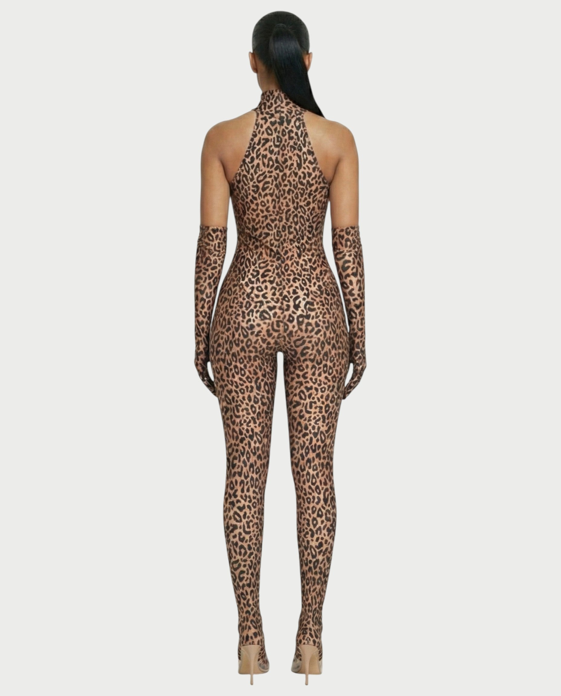 Conjunto de mono y guantes de cuello alto con estampado de leopardo ISALINE