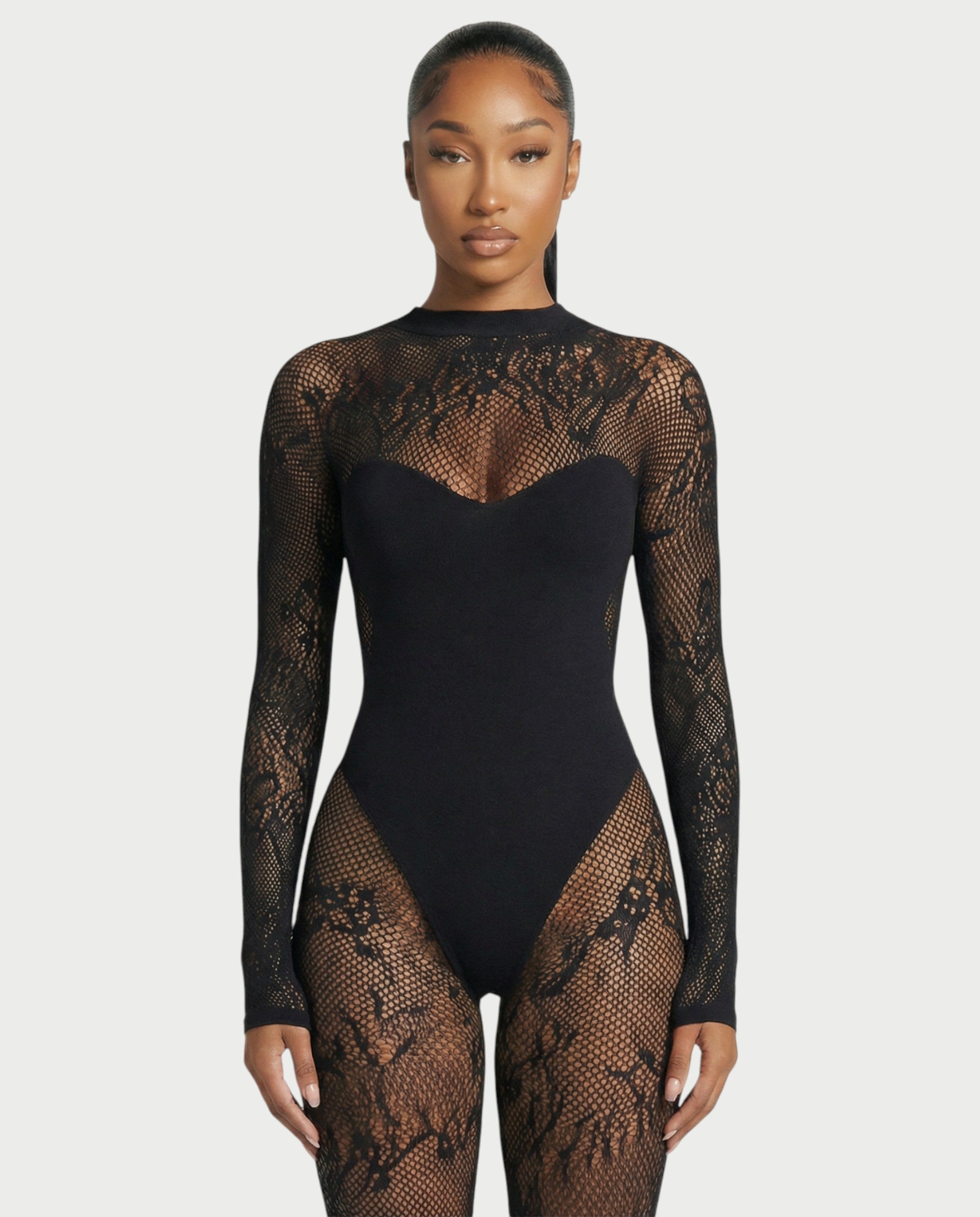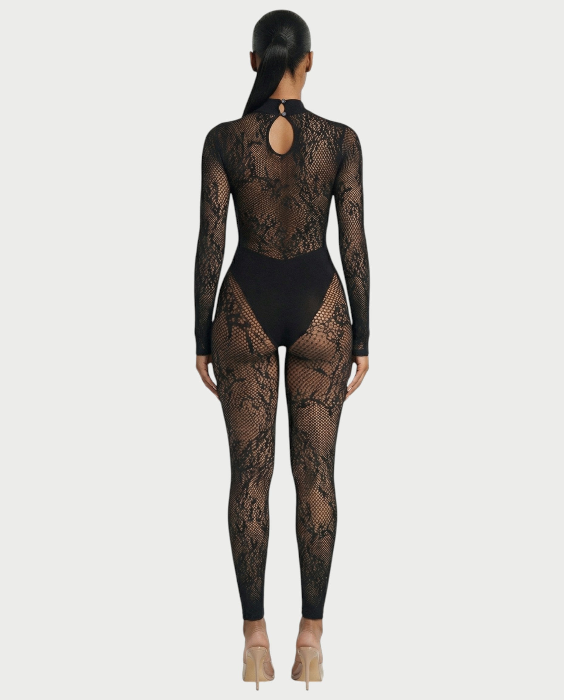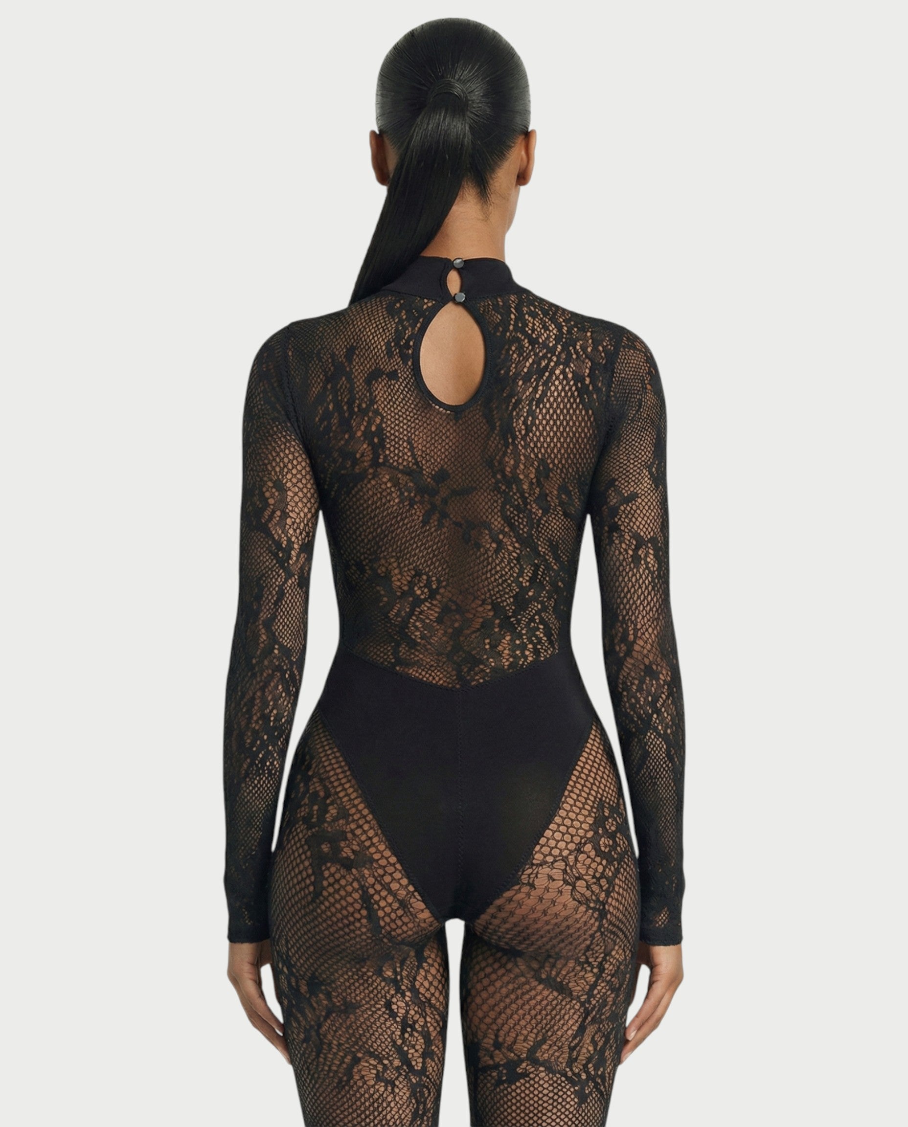 El mono Larya combina elegancia moderna con un sutil encanto. Confeccionado en malla de encaje floral transparente, presenta una silueta elegante y ajustada con mangas largas y un forro tipo body integrado para una cobertura cómoda y sin costuras.