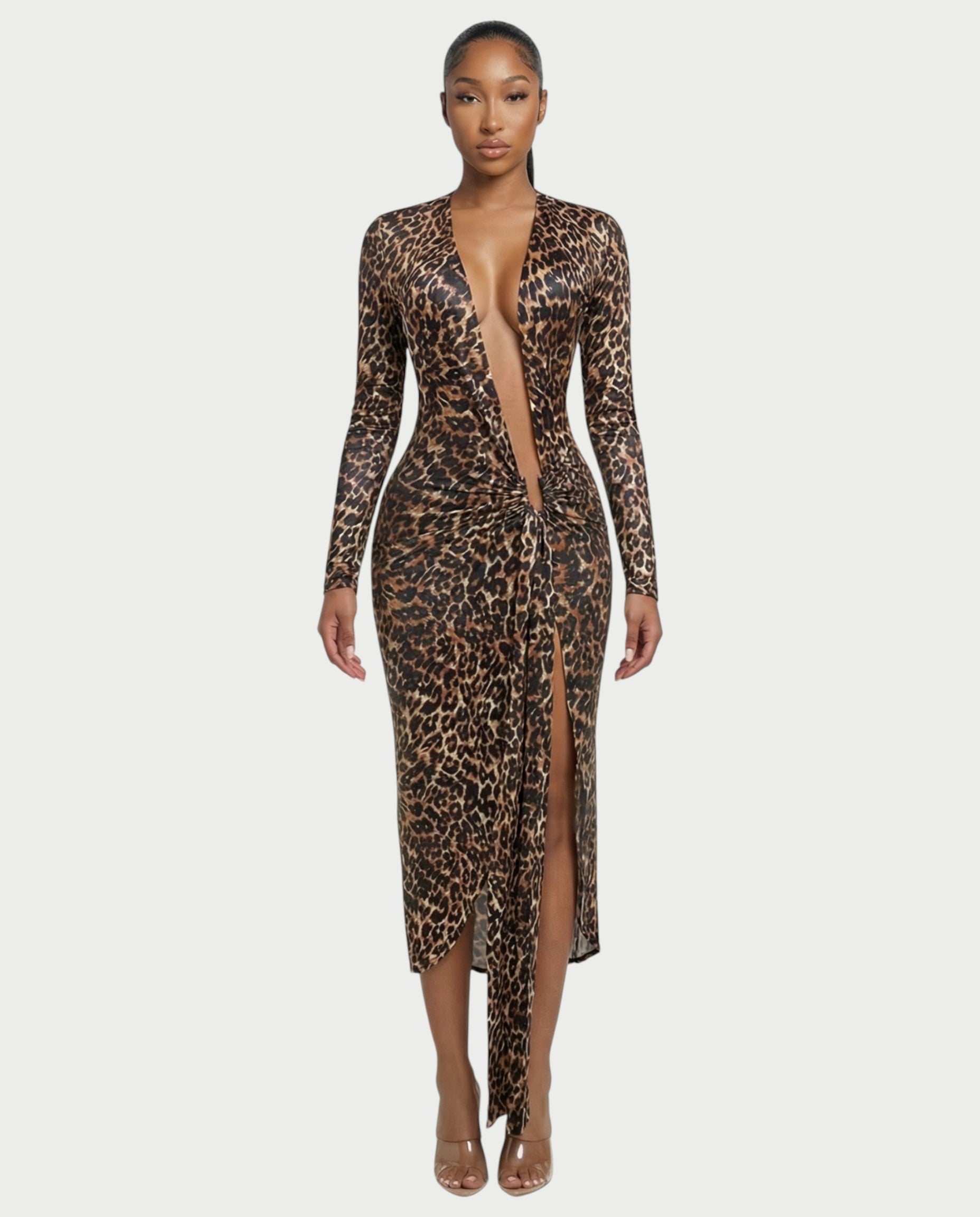Deja volar tu lado salvaje con el vestido Alona, diseñado para llamar la atención a cada paso. Con un escote pronunciado, un detalle fruncido en la cintura y una atrevida abertura hasta el muslo, esta prenda fusiona una energía feroz con una elegante sofisticación. Las mangas largas equilibran el corte sensual, mientras que el drapeado plisado aporta movimiento fluido.
