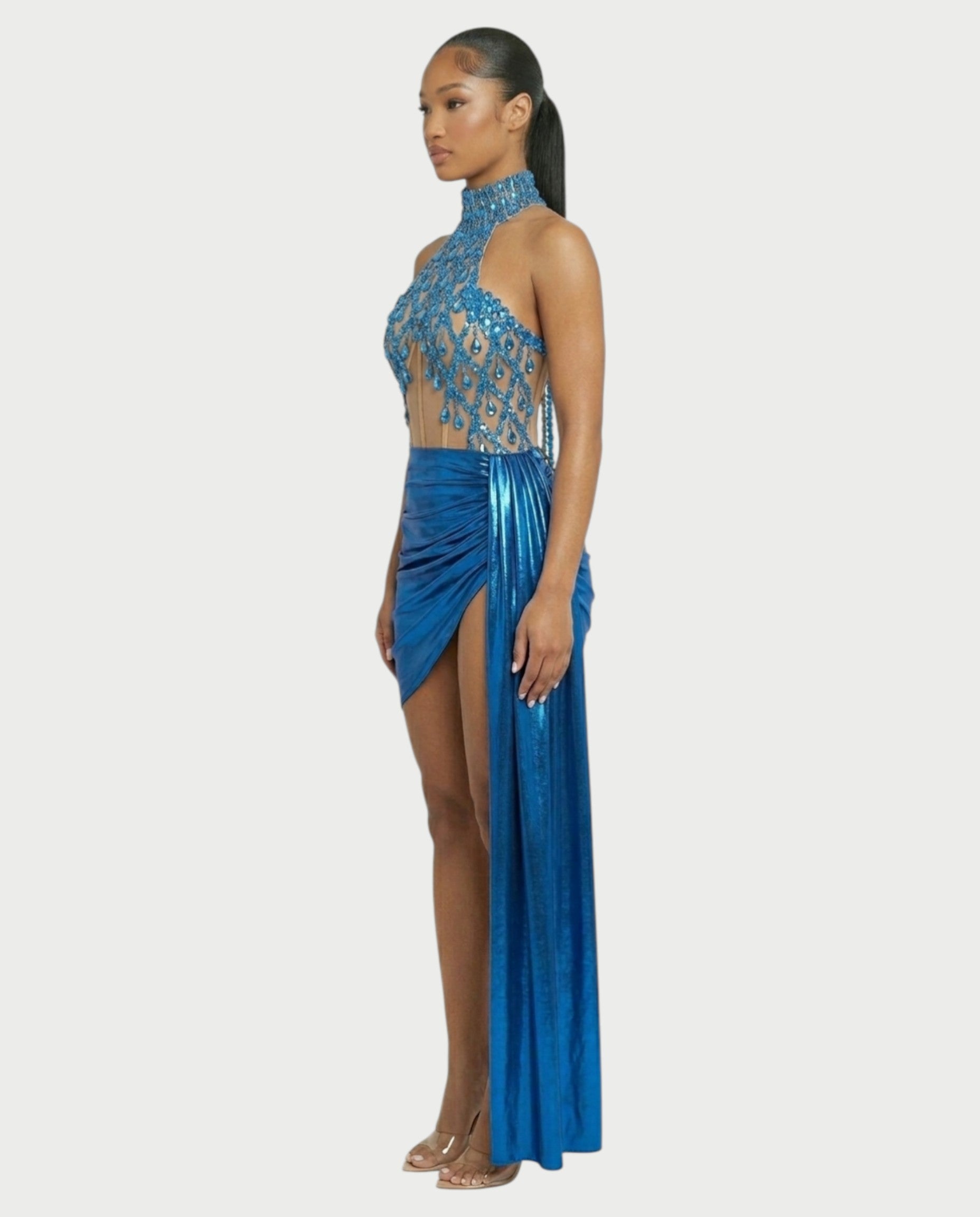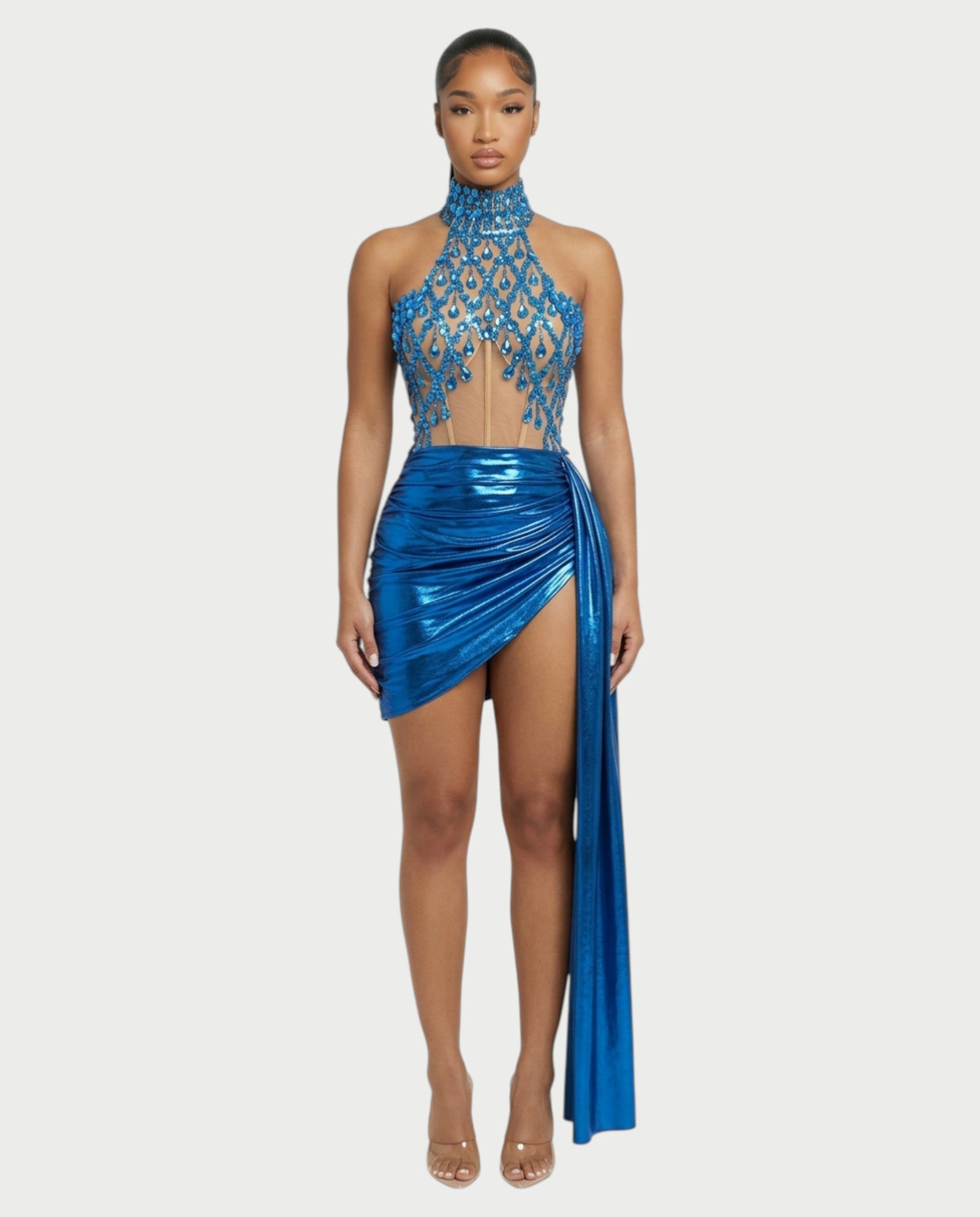 Domina la habitación con el elegante, sensual y lleno de textura vestido Lirra. Con un escote pronunciado, enmarcado por un espectacular ribete de flecos y puños a juego, esta silueta midi esculpe cada curva en su suave tejido elástico.