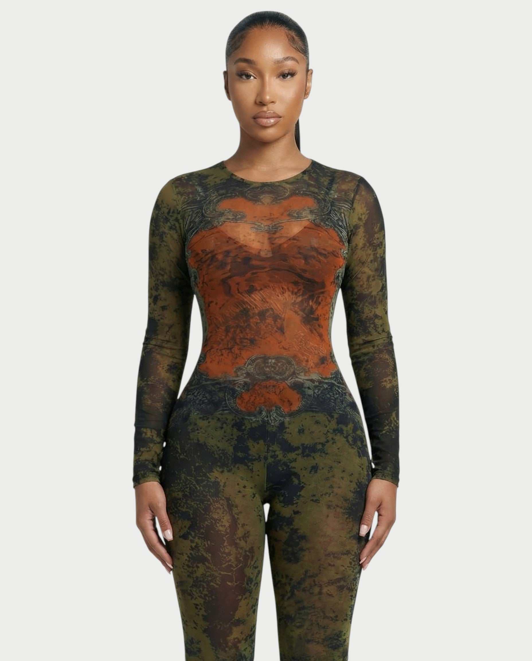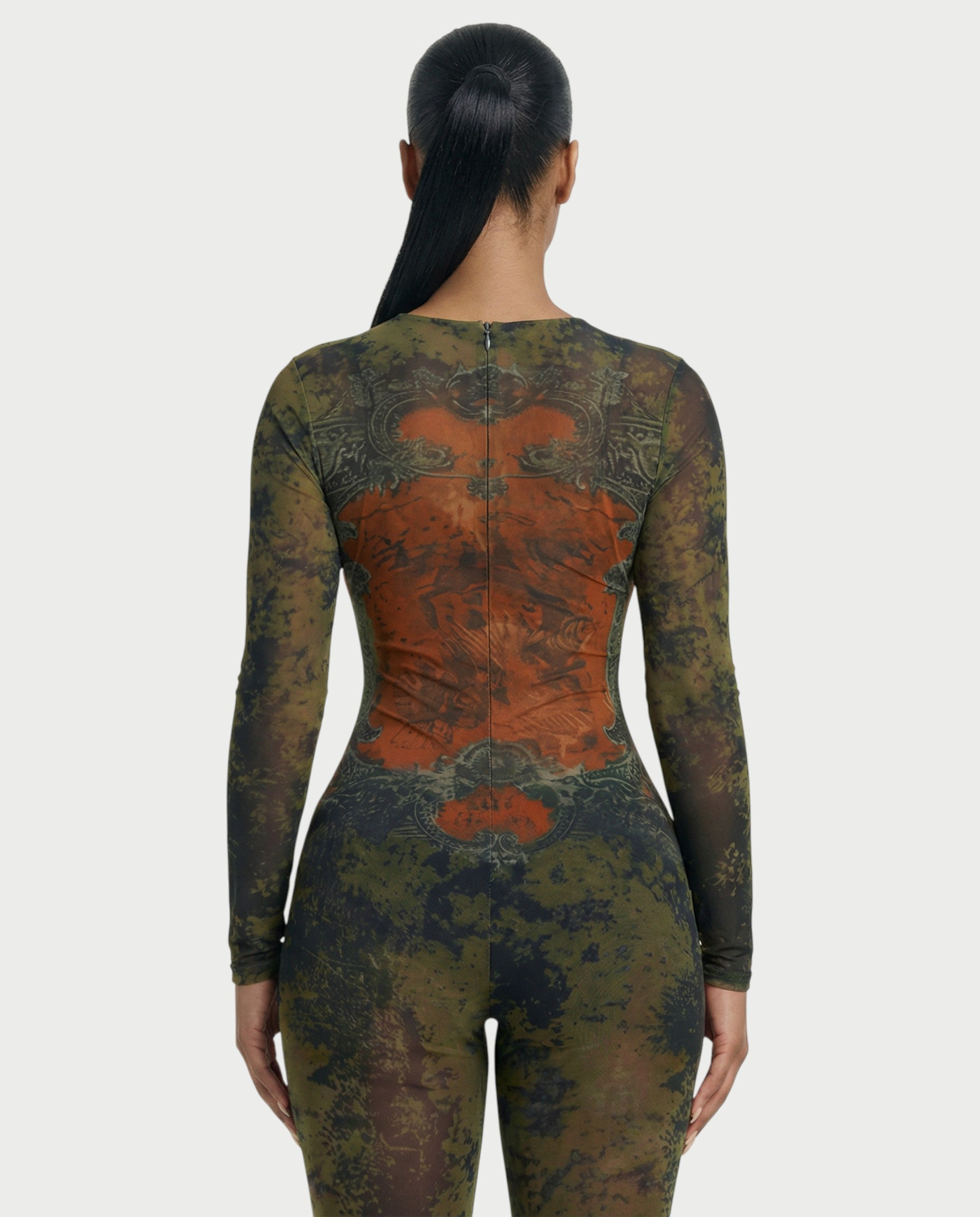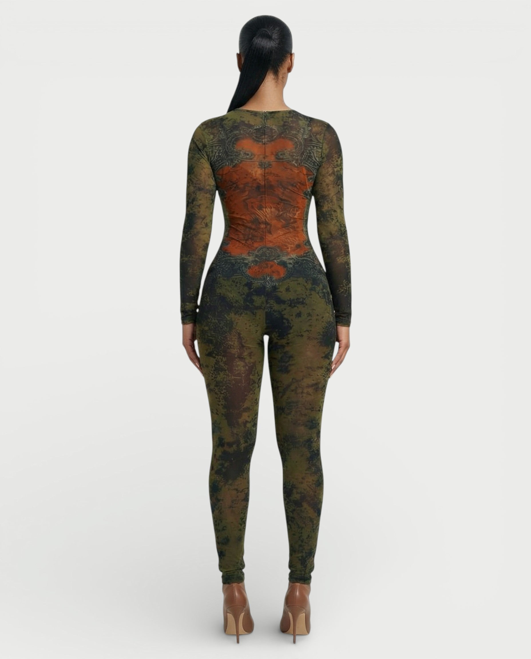 Dale un toque vanguardista a este mono artístico, diseñado para esculpir tu figura. El corte ajustado y las mangas largas crean una silueta estilizada, mientras que el exclusivo estampado de camuflaje y los detalles abstractos le dan un toque inesperado. Confeccionado en un tejido cómodo y elástico, esta prenda se adapta a tus movimientos.
