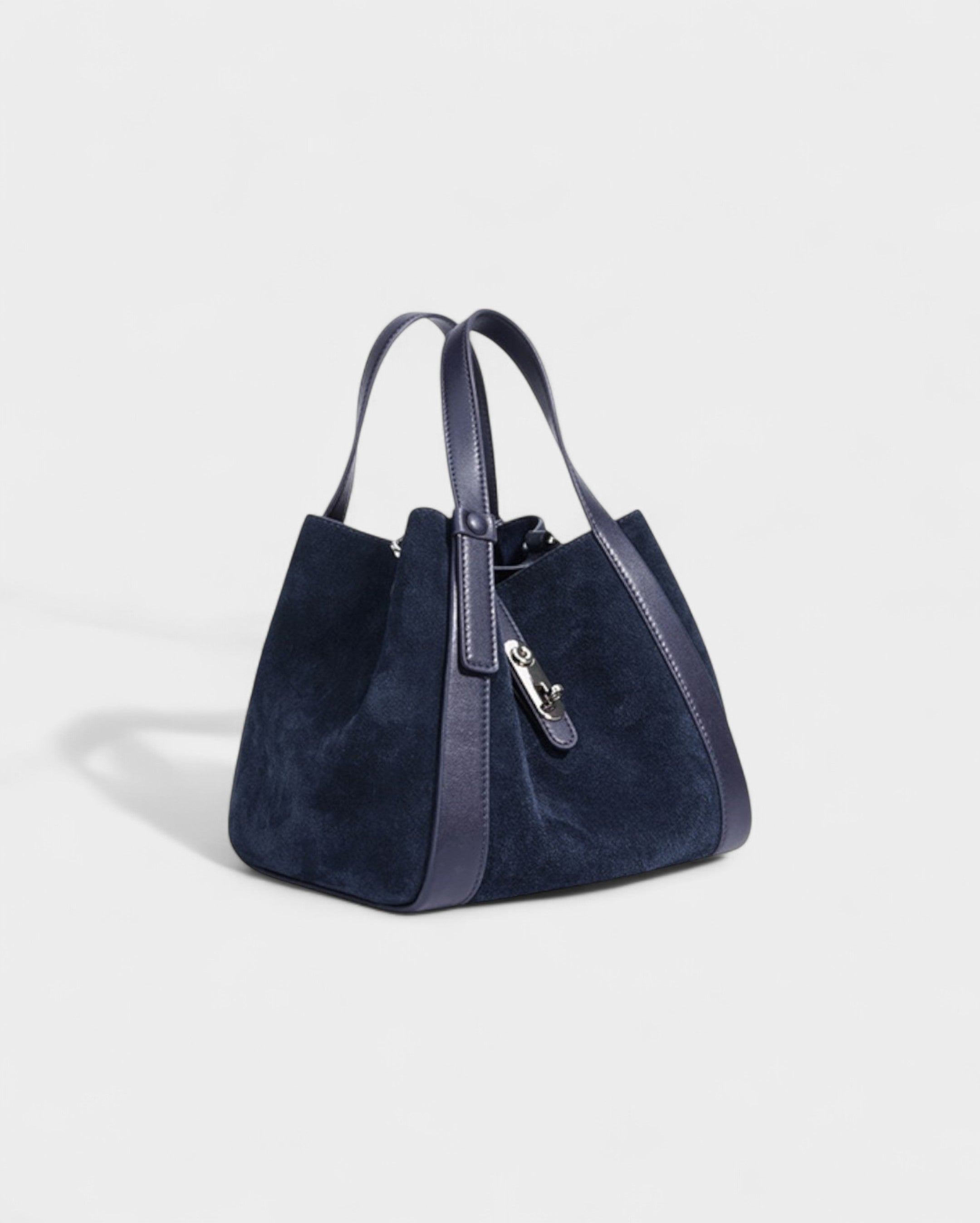 The Karine Bag brings a chic twist to everyday structure. Designed with a suede body and sleek leather trims, its unique basket-inspired silhouette feels both polished and modern. A front strap with a metal turn-lock closure adds just the right touch of edge.