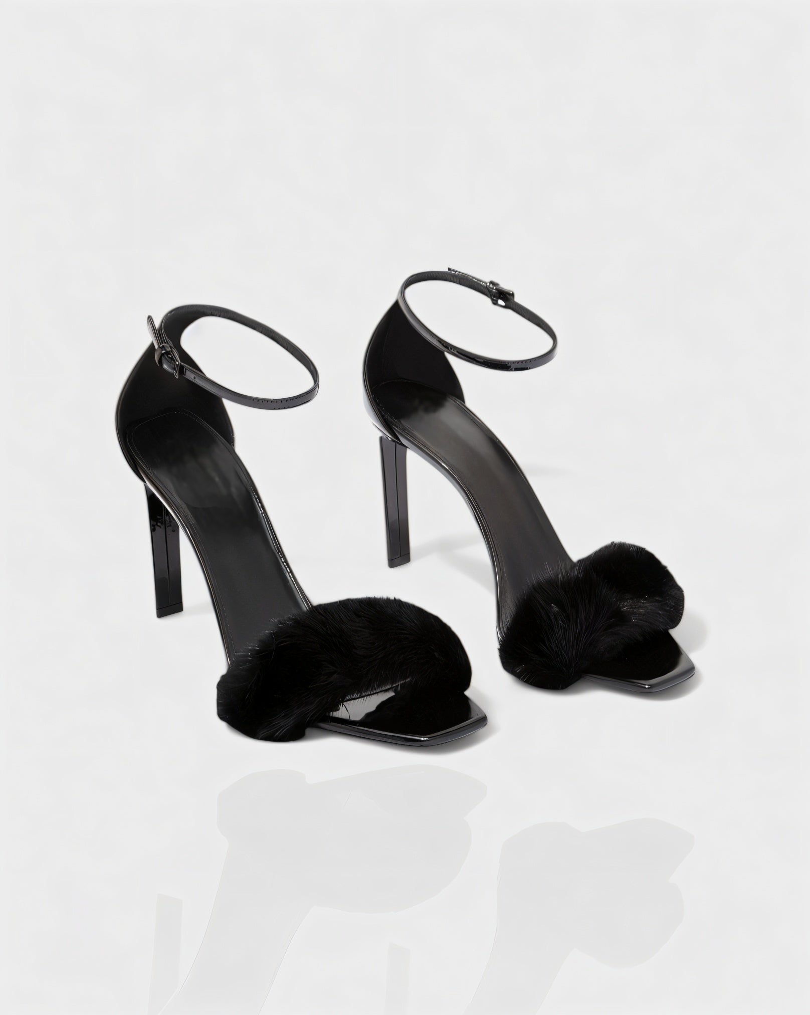The Iluna Heels bring playful glam with a luxe touch. Designed with a sleek high stiletto silhouette, they feature a plush mink fur strap across the toes and a slim ankle closure for balance. Bold yet feminine, these heels instantly elevate any look with their chic, flirty edge.