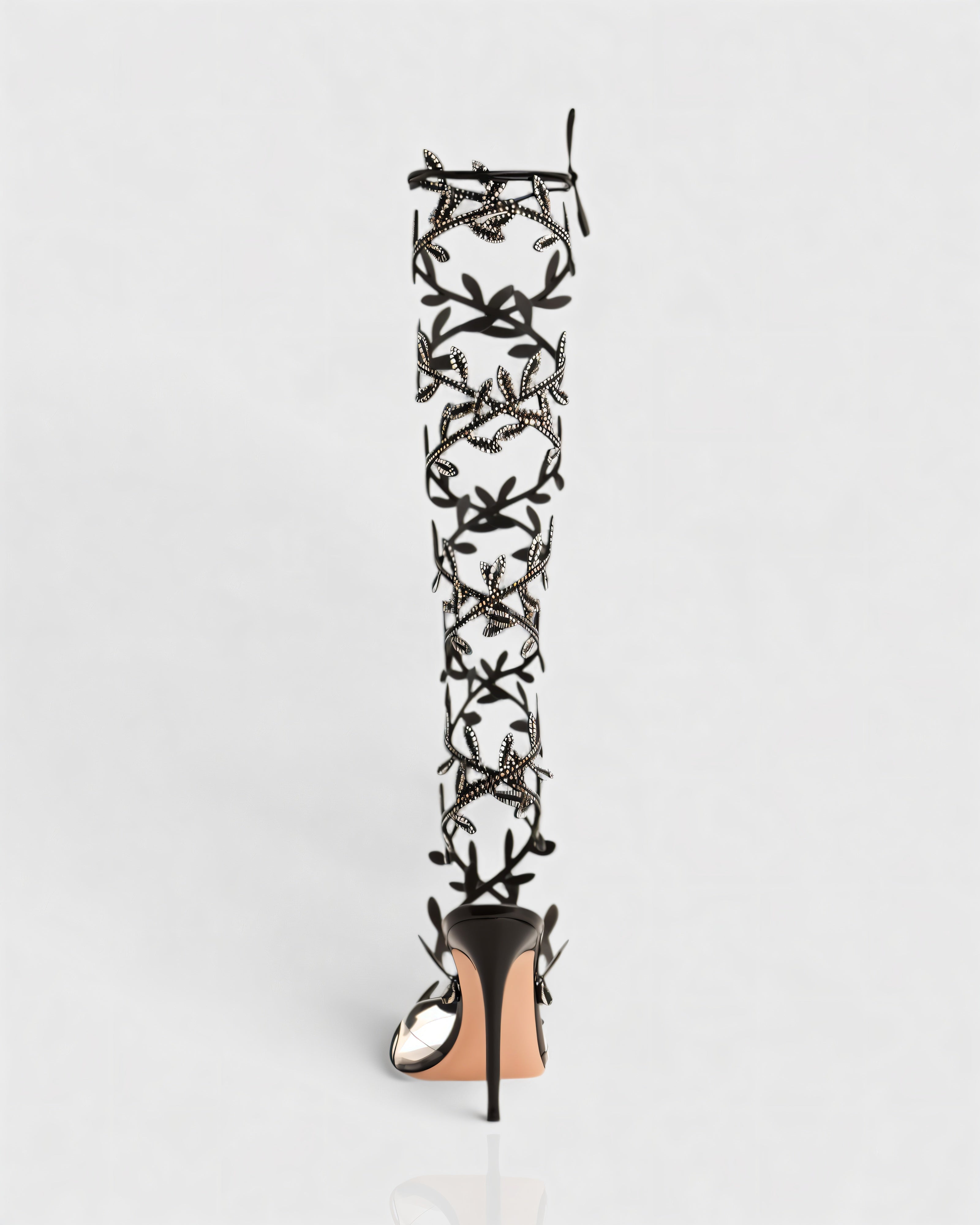 Turn heads in these enchanting high heels, featuring vine-like straps adorned with sparkling crystals that wrap elegantly up the leg. Finished with a sharp pointed toe and stiletto heel, this dramatic design makes an unforgettable statement.