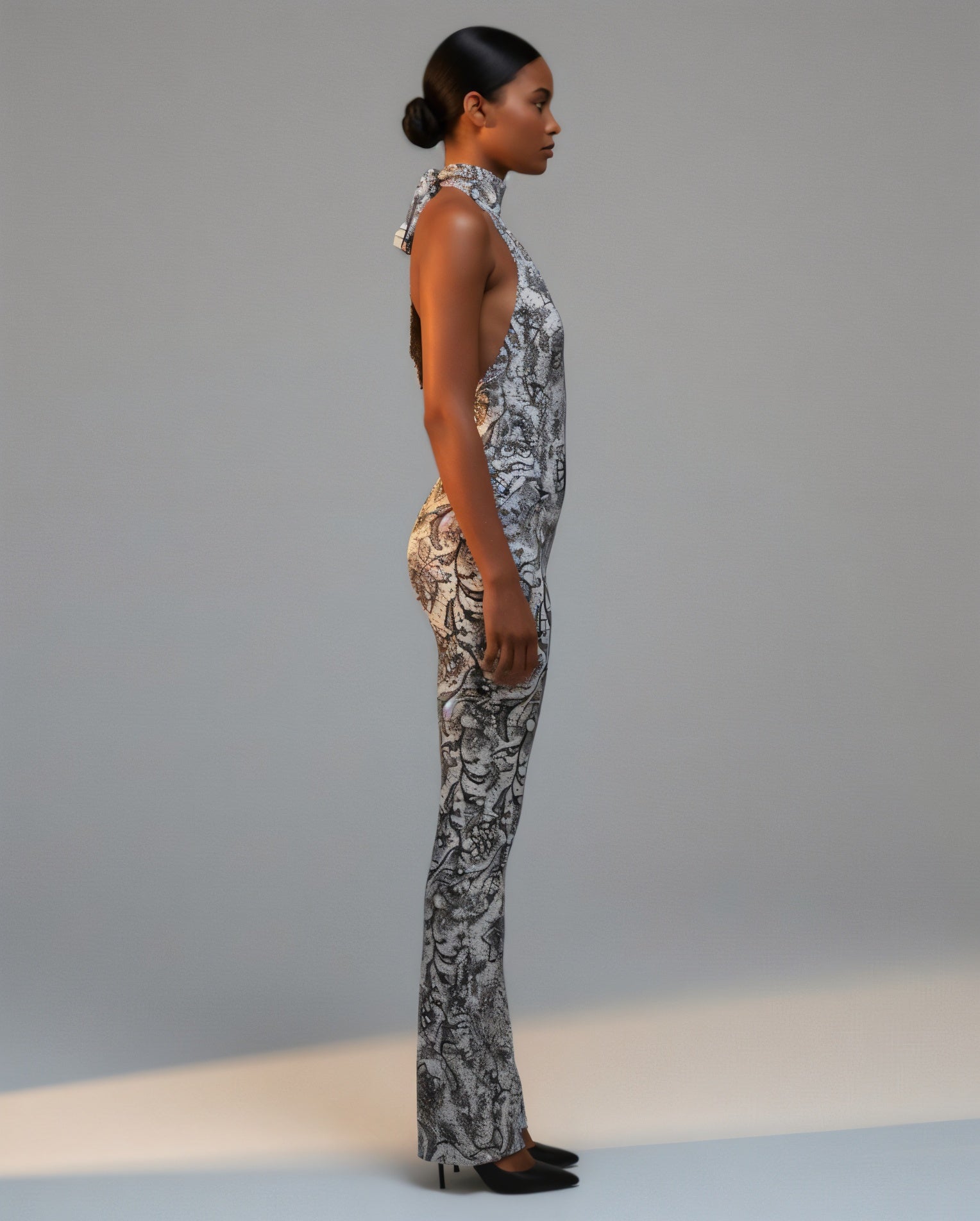 Sleek and seriously chic, this jumpsuit is designed to hug your curves and command attention. The high-neck design and form-fitting silhouette create a stunning look, while the daring backless detail adds an element of surprise. Flaunting a subtle floral print, this piece is the ultimate one-and-done outfit.
