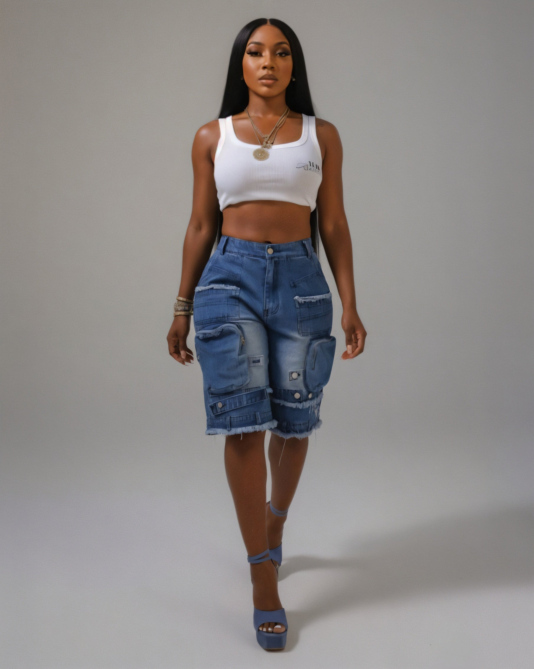 The Salome shorts deliver streetwear edge with a utilitarian twist. Crafted from faded denim with intentional distressing and raw hems, these longline cargo shorts feature oversized flap pockets, stitched detailing, and a relaxed, slouchy fit that lands just at the knee.