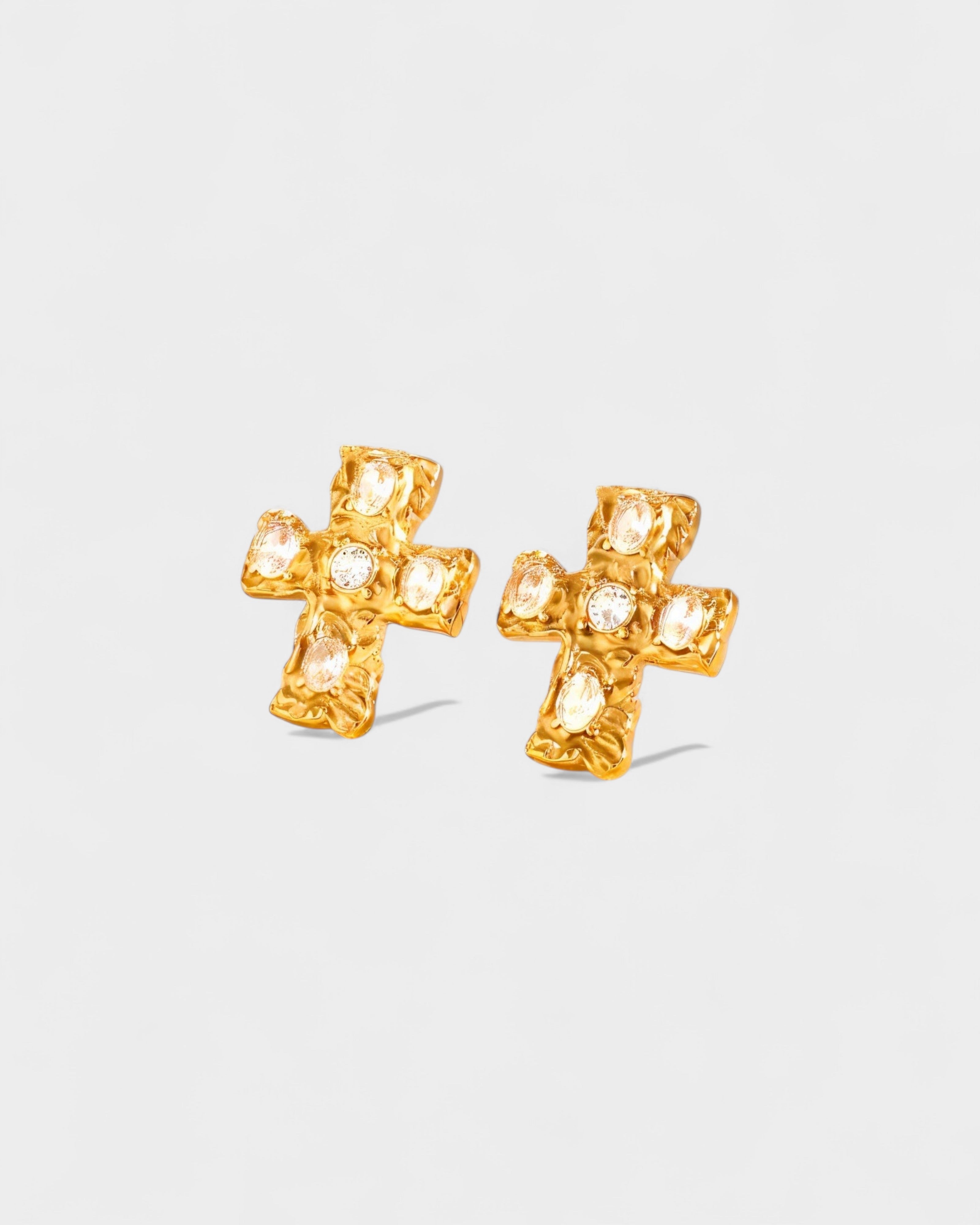 The Maine Multi-Stone Earrings deliver bold character with a luxe twist. Crafted in a hammered gold-tone finish, each cross stud is accented with vibrant multi-colored stones for a striking pop. Sculptural and statement-making, they bring instant edge to any look.
