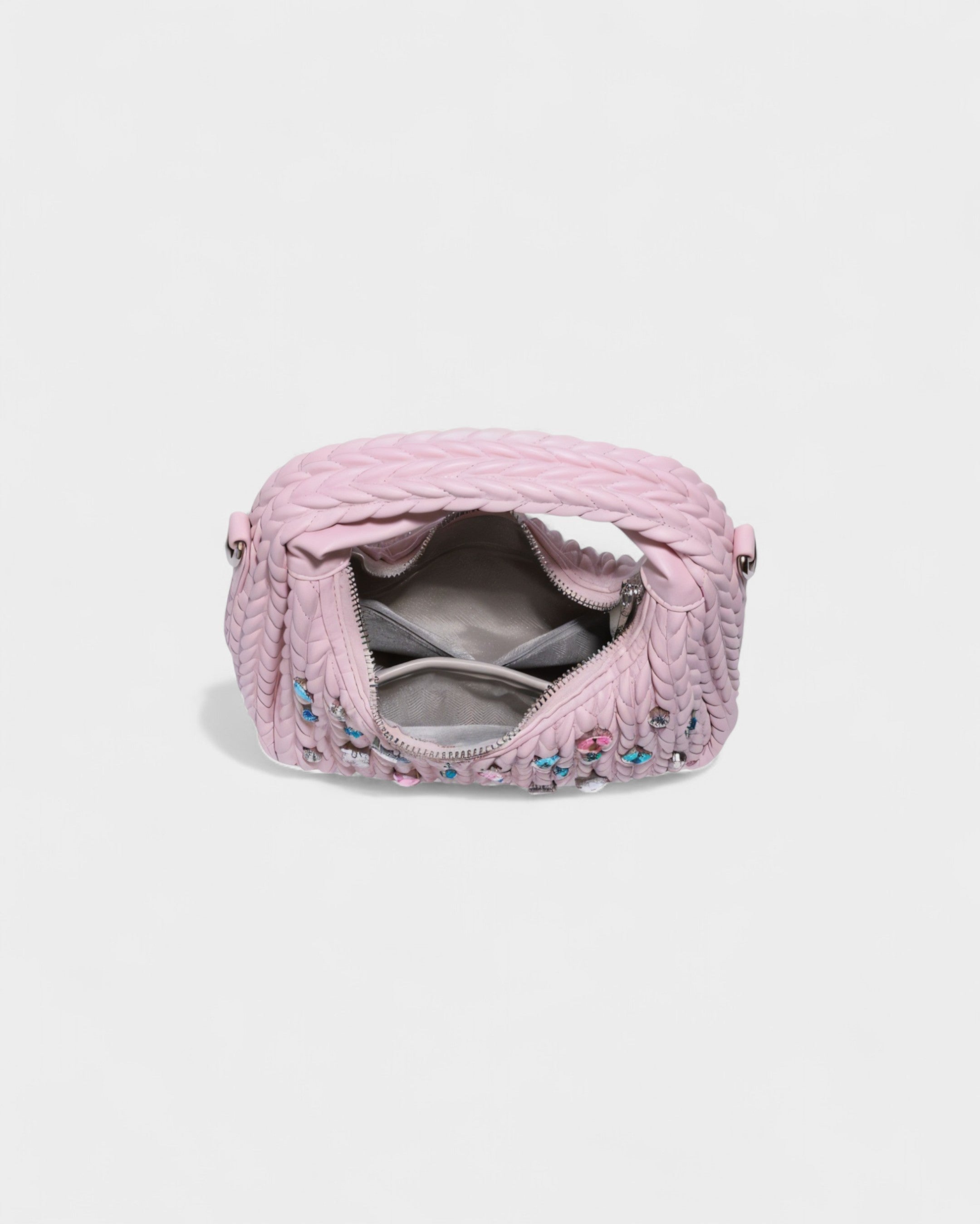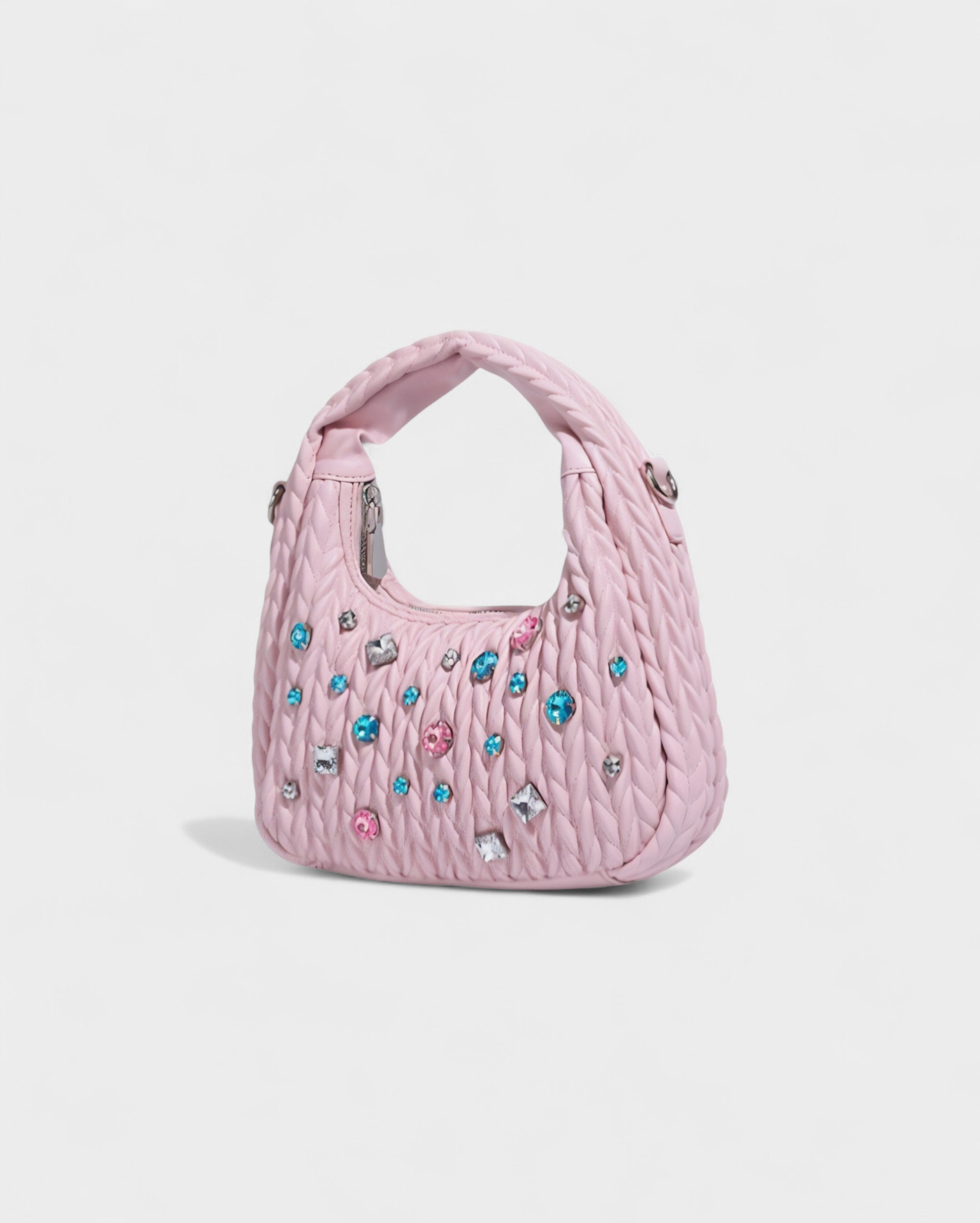 Designed in a quilted finish and adorned with multicolored crystal embellishments, it shines from every angle. Its structured silhouette features a top handle and a detachable crossbody strap, offering versatile ways to wear.