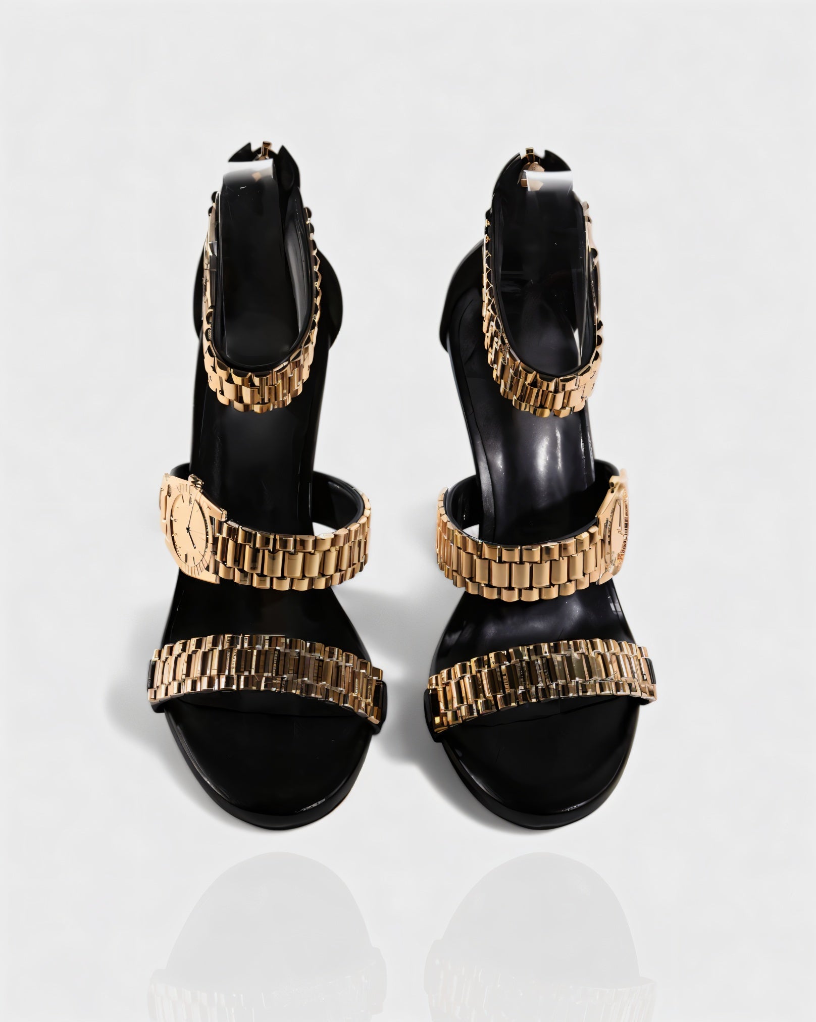 Step out in high-fashion style with these unique and glamorous high heels. The straps are meticulously designed to mimic the look of luxury watchbands, complete with intricate gold-toned links and a watch-face detail on the ankle strap. A sharp stiletto heel and a slim toe strap complete the look, making these a truly one-of-a-kind statement piece.