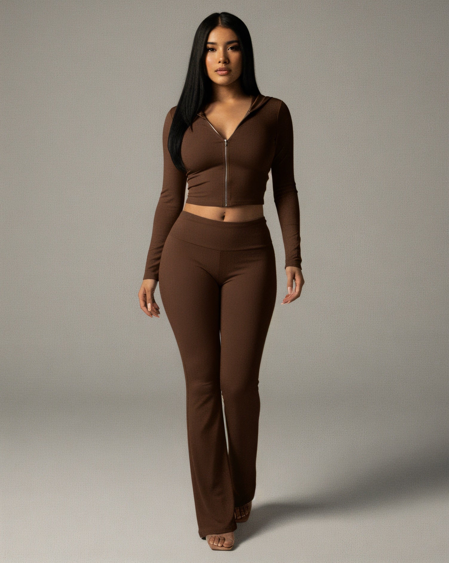 Designed for ultimate comfort and undeniable style. This two-piece set features a figure-flattering zip-up hoodie and chic flare pants, both crafted from a soft, stretch fabric that moves with you. It’s the perfect ensemble for making a statement wherever you go.