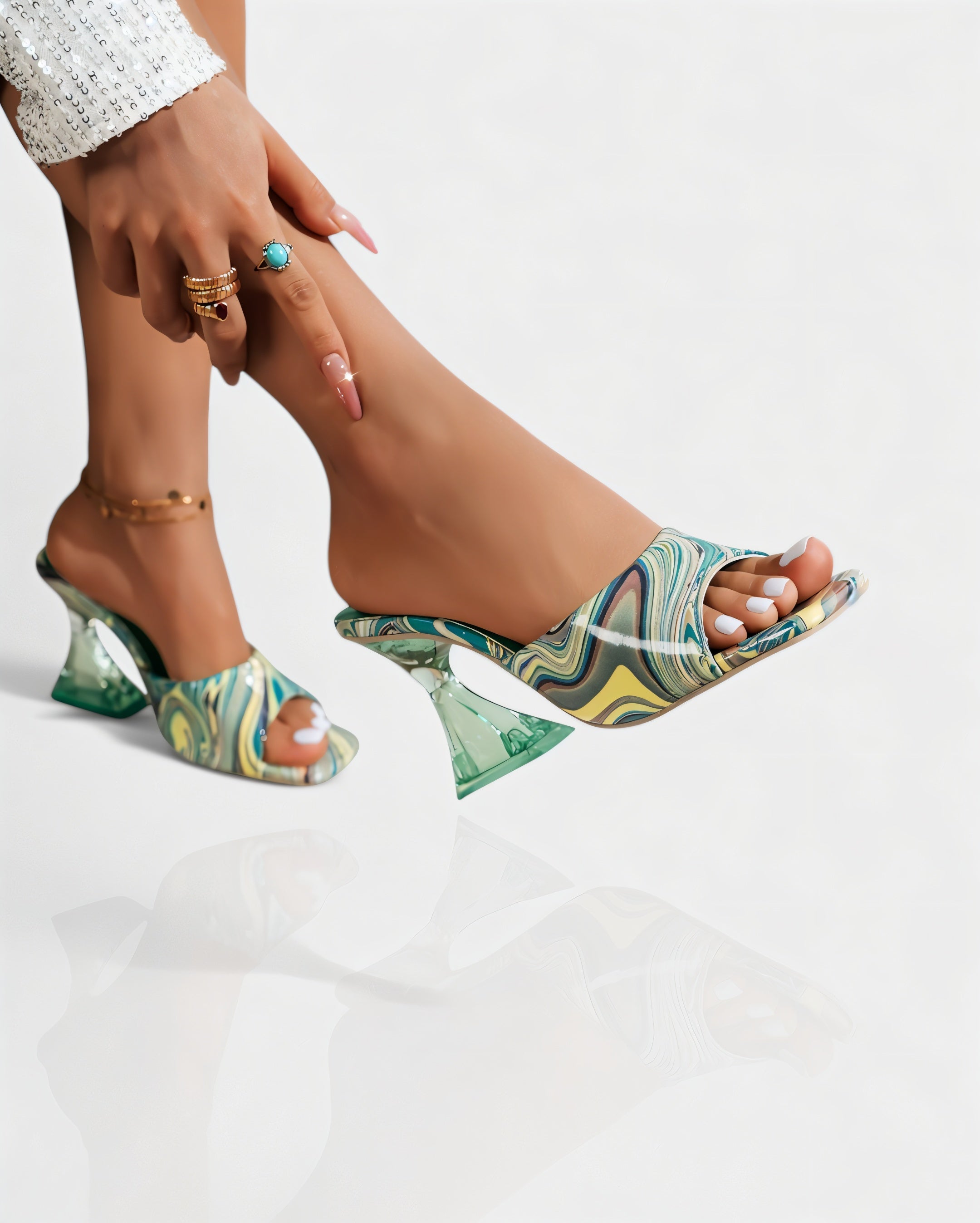 Show off high-fashion style with these unique open-toe heels. A wide strap across the toes highlights a striking marbled pattern, creating a stunning contrast with the sleek sculptural heel. The tall, transparent heel completes the look with a modern, artistic flair.