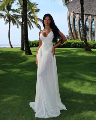 LUMIERE Ruched Sheer-Panel Maxi Dress with Bow Details