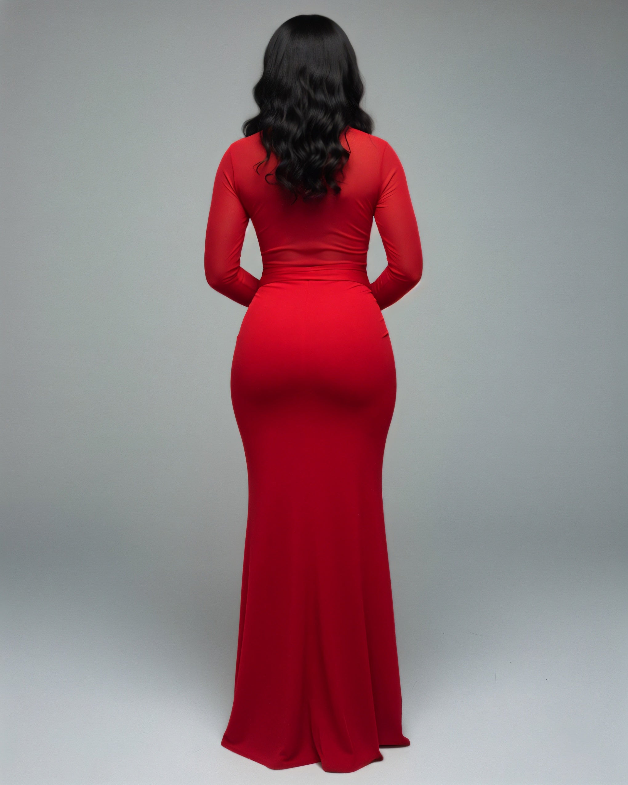 The Valeya Dress delivers sheer sophistication with a daring twist. Designed with mesh paneling through the bodice and a bold twist-front detail, this maxi hugs every curve in smooth, stretch fabric.
