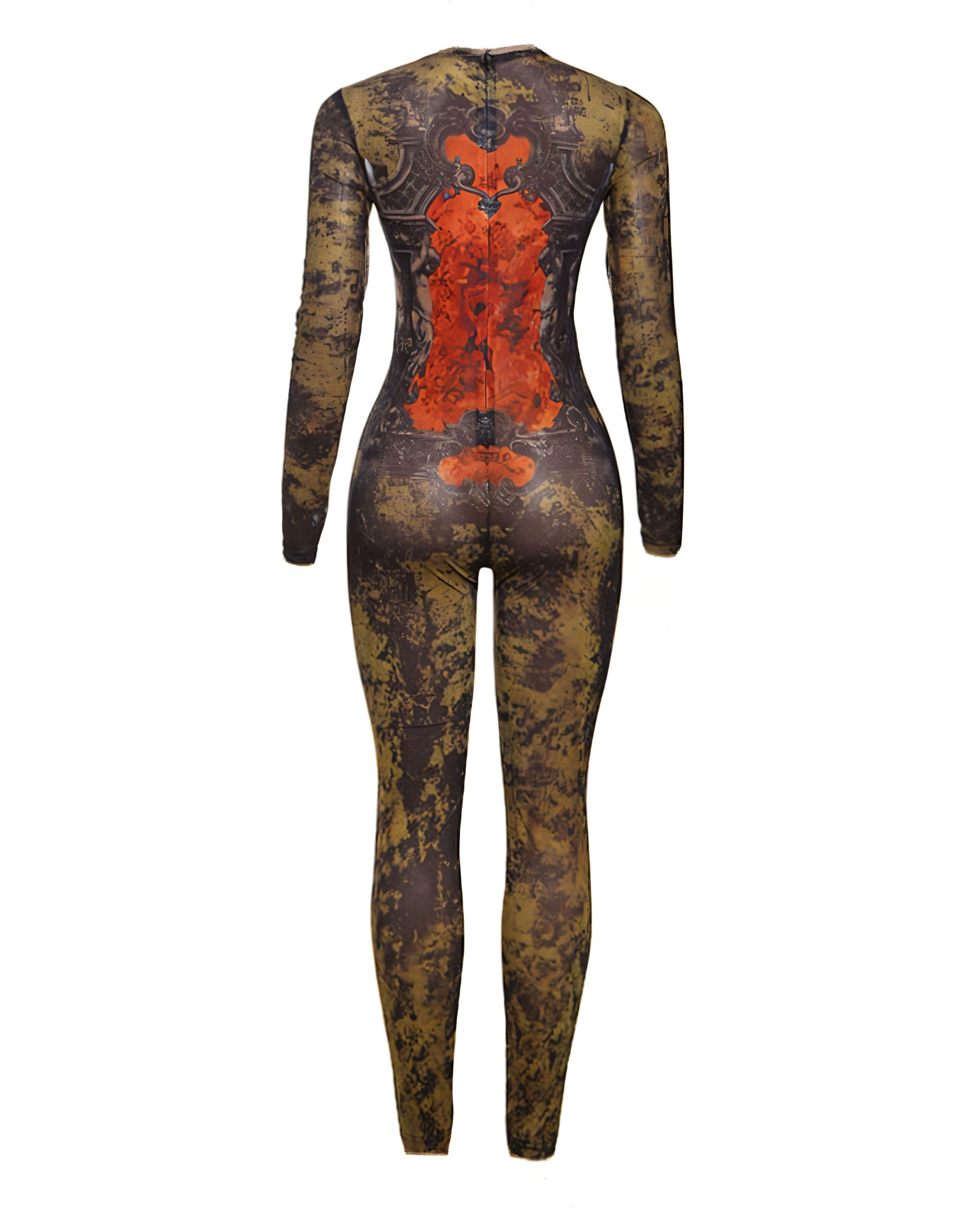 Channel an edgy vibe in this artistic jumpsuit designed to sculpt your figure. The bodycon fit and long sleeves create a sleek silhouette, while the unique camouflage print and abstract detailing add an unexpected twist. Made from a comfortable, stretch-infused fabric, this piece moves with you.