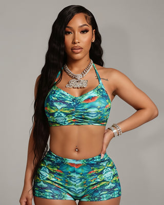 DIORA Halter Cowl Neck Crop Top & High Waist Shorts Set