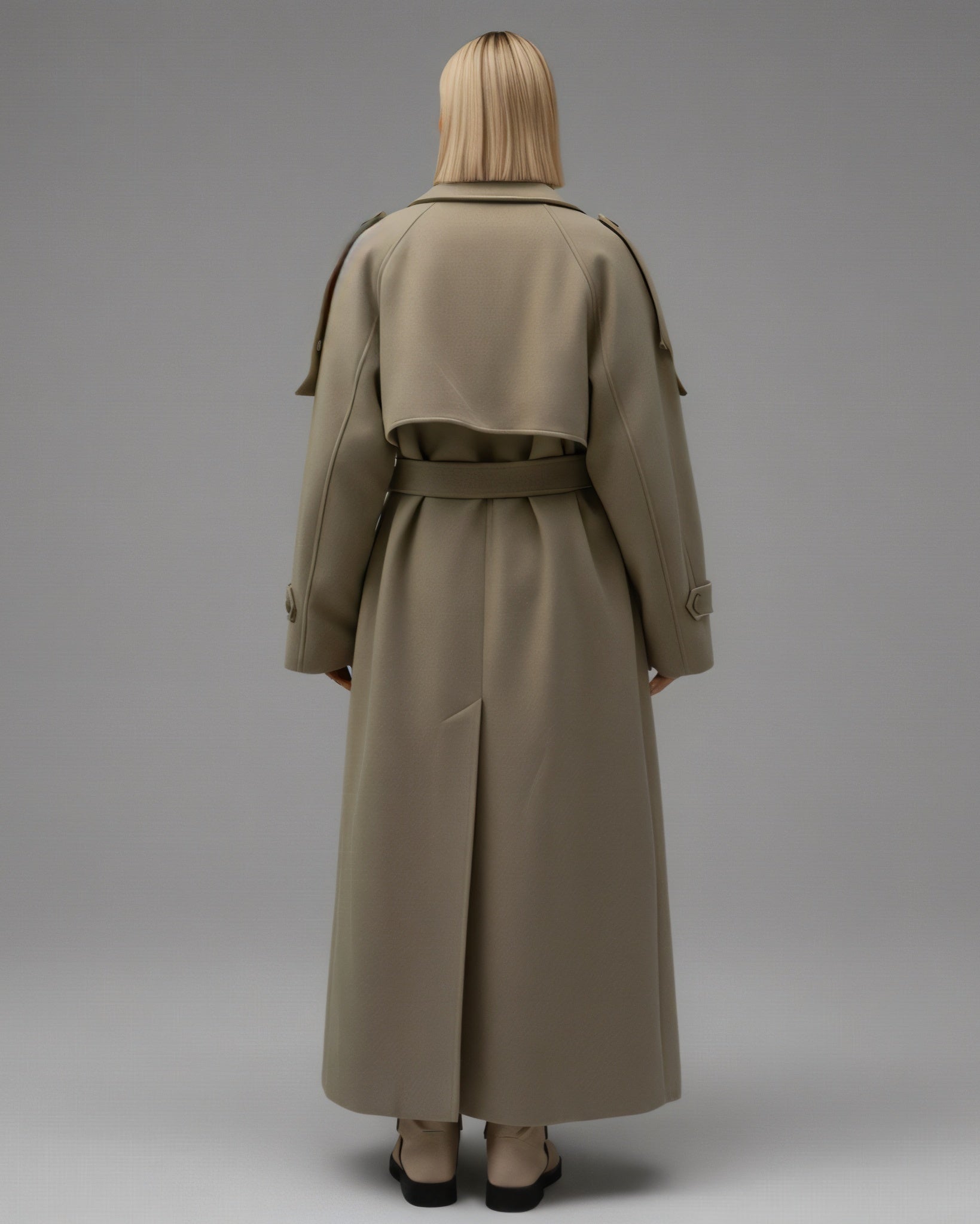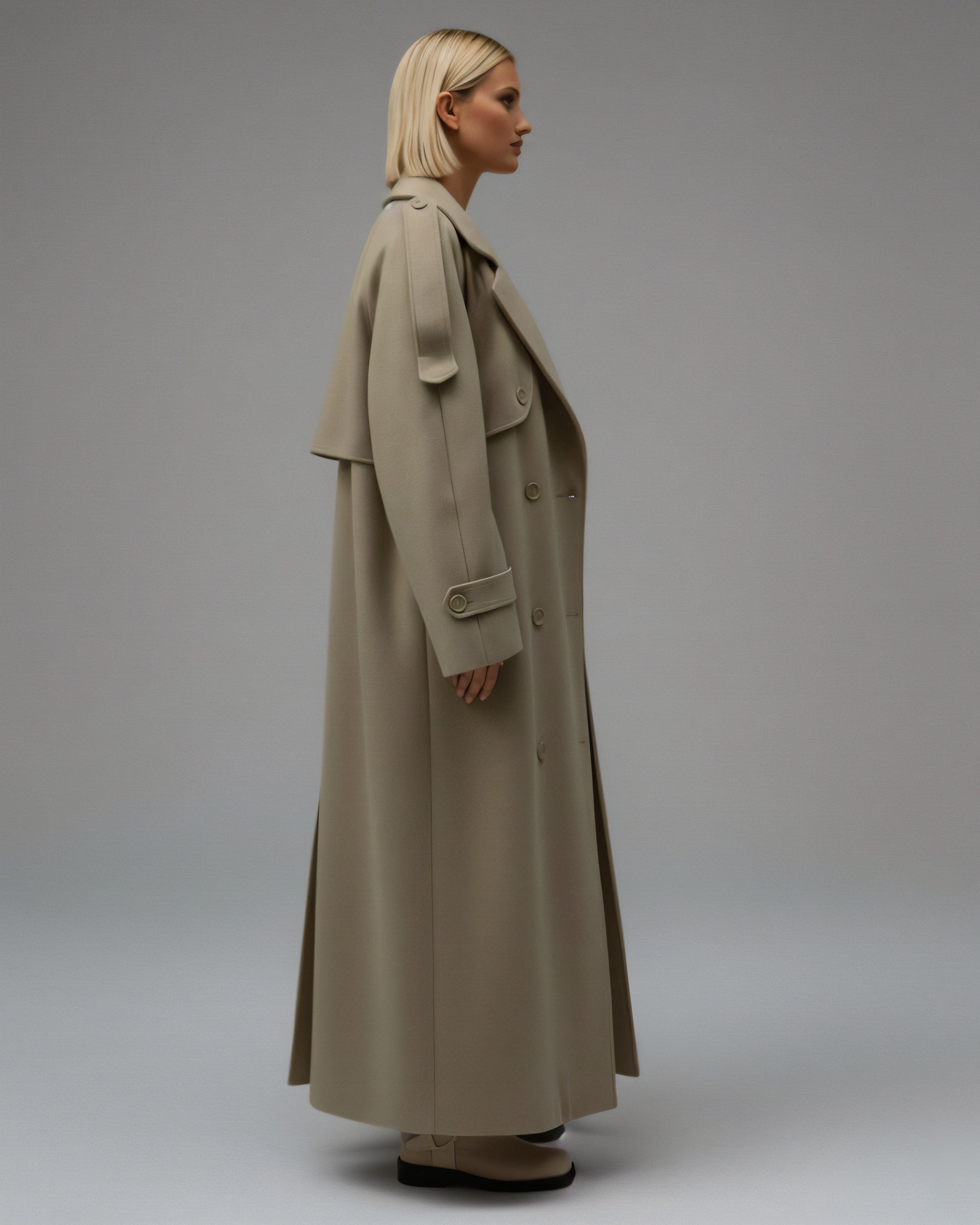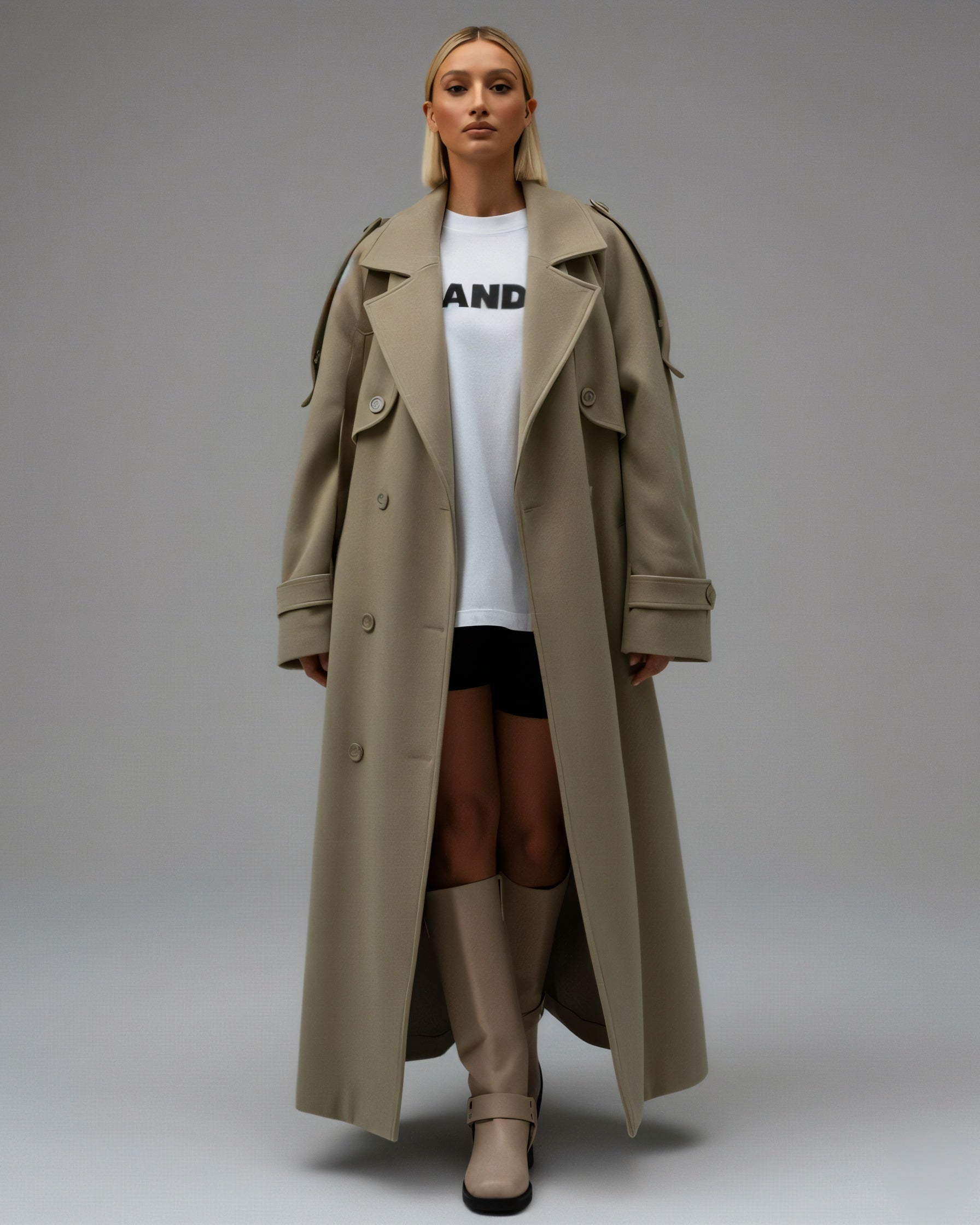 The Aida Coat redefines outerwear with its sweeping silhouette and luxe tailoring. Designed with an exaggerated oversized fit, this coat features dropped shoulders, a belted waist, and a dramatic maxi length for maximum impact. Crafted from a structured wool blend, it blends warmth with polished sophistication.