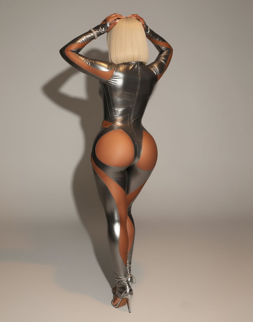 The Shaya jumpsuit combines sheer mesh with high-shine metallic fabric for a futuristic, body-contouring look. It features a high neckline, long sleeves, and strategically placed metallic panels that create bold geometric shapes. Sheer mesh insets run through the bodice, sleeves, and legs, offering skin-baring contrast while enhancing the sculpted silhouette.