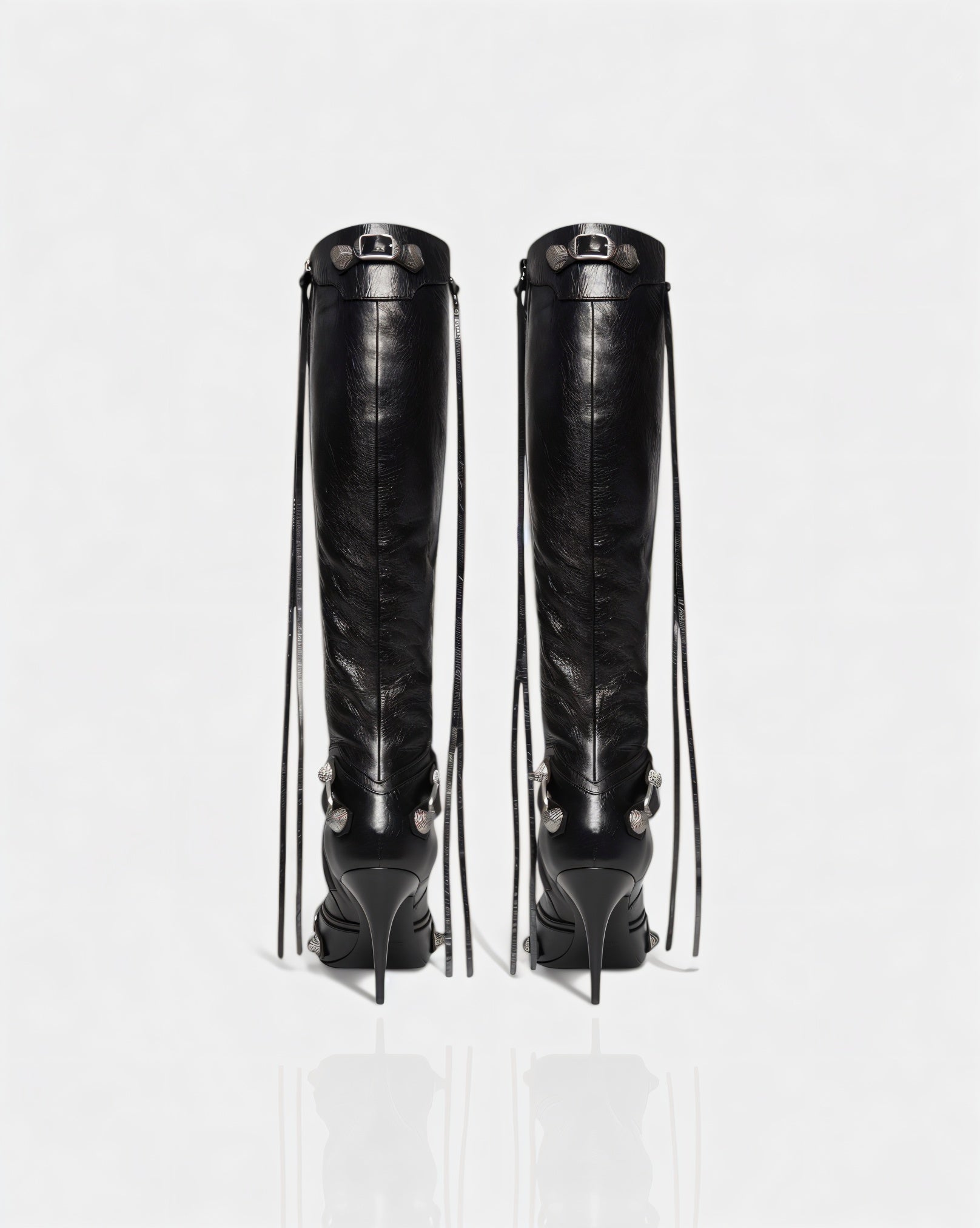 Make a bold entrance with the Wena knee-high boots. Designed with a pointed toe, sleek stiletto heel, and glossy faux leather, they’re finished with metallic buckle accents for a rebellious yet sophisticated edge perfect for elevating any outfit.