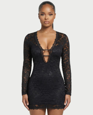 ZAYRIA Deep Plunge Sheer Lace Mini Dress